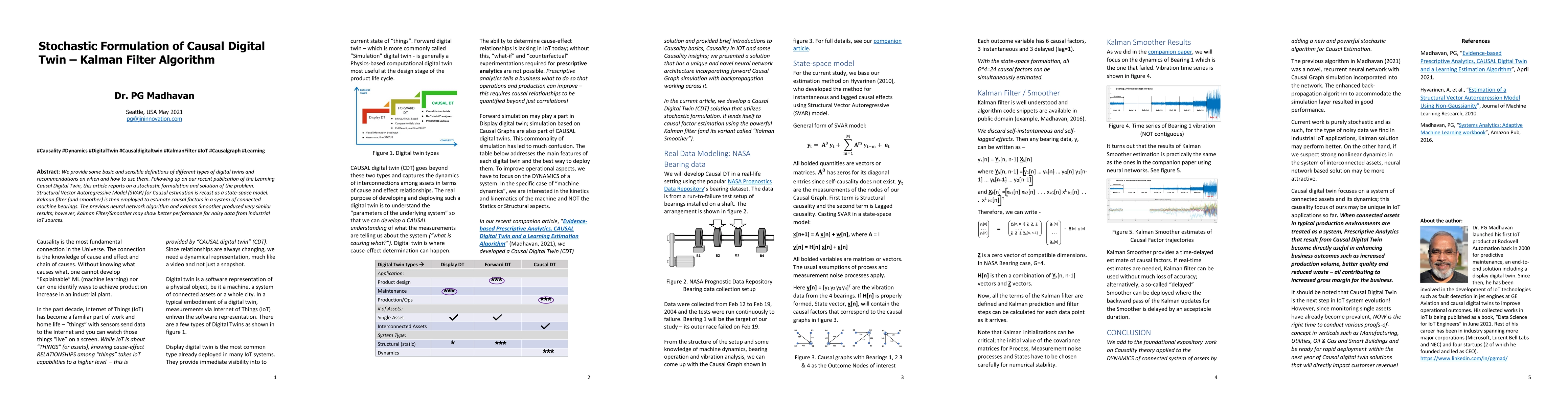 We provide some basic and sensible definitions of different types of digital twins and recommendations on when and how to use them. Following up on our recent publication of the Learning Causal Digital Twin, this article reports on a stochastic formulation and solution of the problem. Structural Vector Autoregressive Model (SVAR) for Causal estimation is recast as a state-space model. Kalman filter (and smoother) is then employed to estimate causal factors in a system of connected machine bearings. The previous neural network algorithm and Kalman Smoother produced very similar results; however, Kalman Filter/Smoother may show better performance for noisy data from industrial IoT sources.