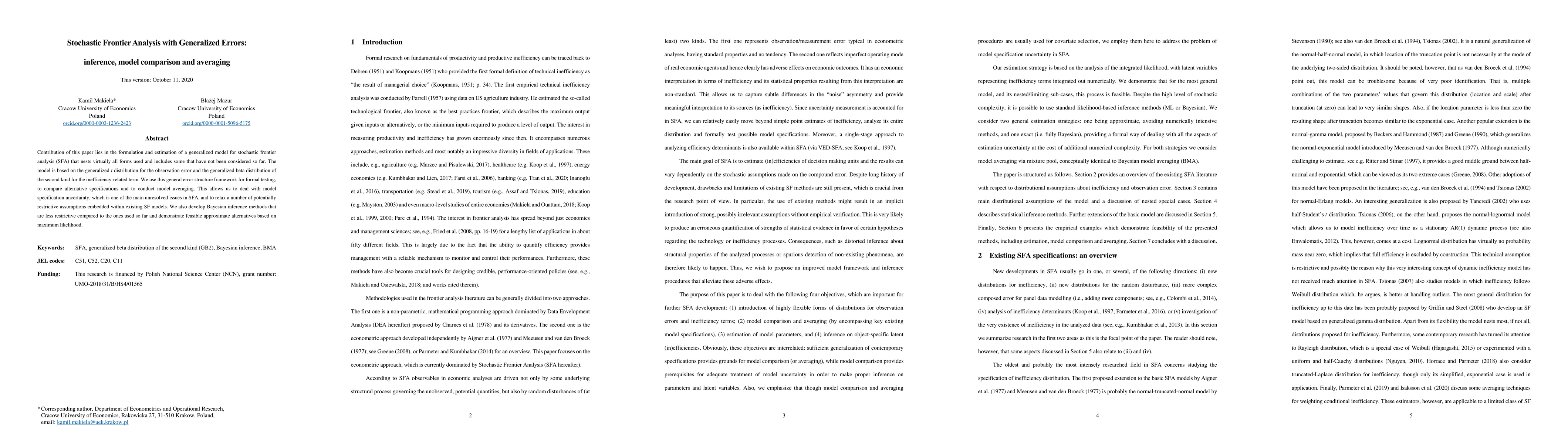 This paper proposes a generalized stochastic frontier analysis model based on the generalized t distribution and the generalized beta distribution of the second kind, allowing for model comparison and averaging. It addresses model specification uncertainty and develops less restrictive Bayesian inference methods with feasible maximum likelihood alternatives.