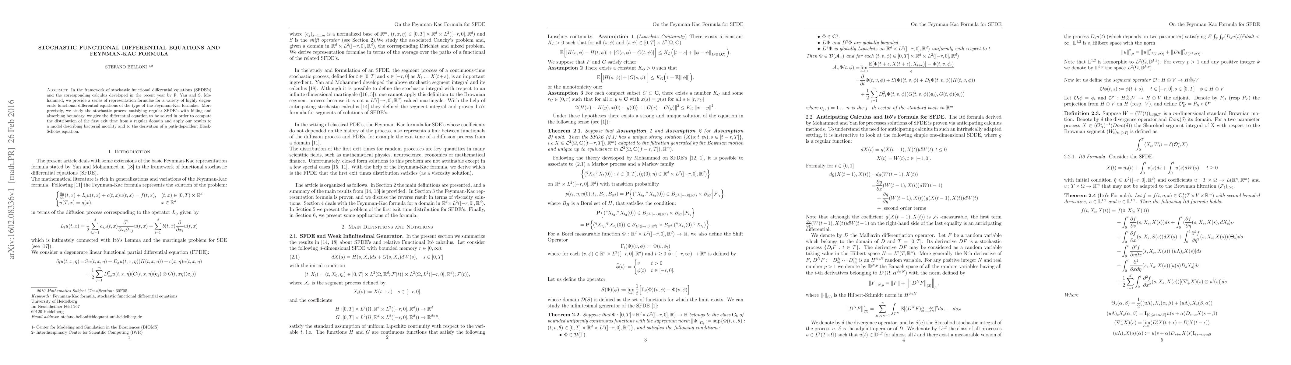 This paper develops representation formulae for stochastic functional differential equations (SFDEs) and applies the Feynman-Kac formula to compute the distribution of first exit times from a domain. It also extends these results to models of bacterial motility and path-dependent financial equations.