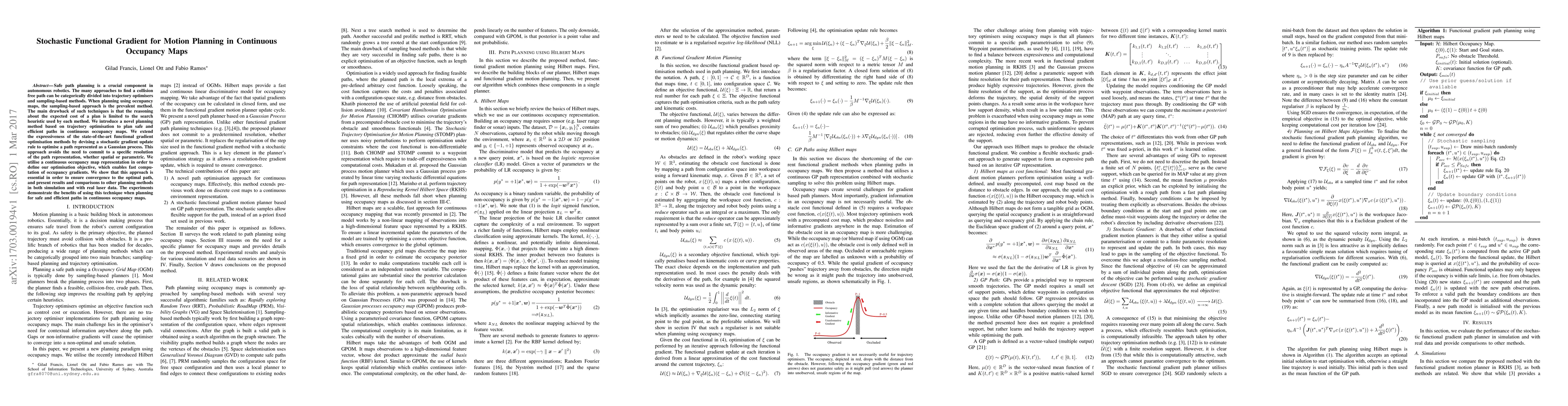 This paper presents a novel stochastic functional gradient method for safe and efficient motion planning in continuous occupancy maps, extending functional gradient optimisation with a stochastic gradient update rule for path representation as a Gaussian process, and demonstrating its effectiveness through simulations and real-world experiments.