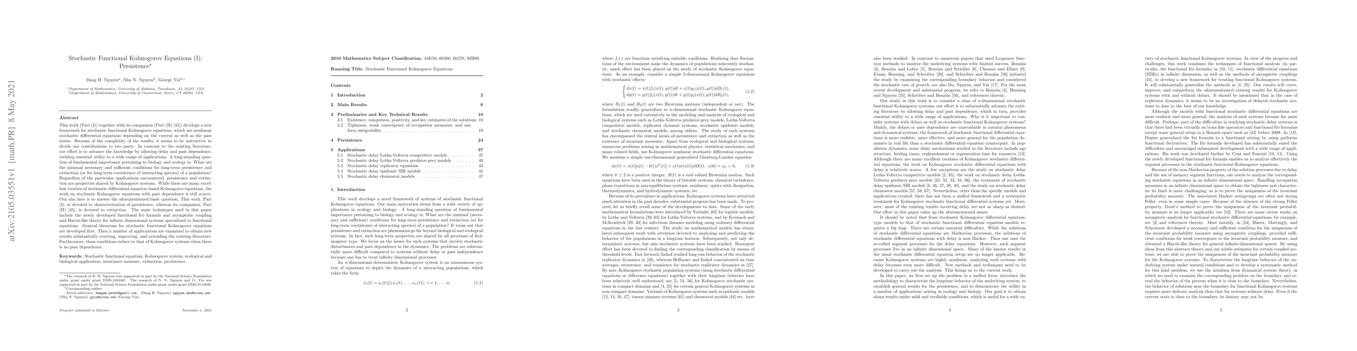 This work (Part (I)) together with its companion (Part (II) [45]) develops a new framework for stochastic functional Kolmogorov equations, which are nonlinear stochastic differential equations depending on the current as well as the past states. Because of the complexity of the results, it seems to be instructive to divide our contributions to two parts. In contrast to the existing literature, our effort is to advance the knowledge by allowing delay and past dependence, yielding essential utility to a wide range of applications. A long-standing question of fundamental importance pertaining to biology and ecology is: What are the minimal necessary and sufficient conditions for long-term persistence and extinction (or for long-term coexistence of interacting species) of a population? Regardless of the particular applications encountered, persistence and extinction are properties shared by Kolmogorov systems. While there are many excellent treaties of stochastic-differential-equation-based Kolmogorov equations, the work on stochastic Kolmogorov equations with past dependence is still scarce. Our aim here is to answer the aforementioned basic question. This work, Part (I), is devoted to characterization of persistence, whereas its companion, Part (II) [45], is devoted to extinction. The main techniques used in this paper include the newly developed functional It^o formula and asymptotic coupling and Harris-like theory for infinite dimensional systems specialized to functional equations. General theorems for stochastic functional Kolmogorov equations are developed first. Then a number of applications are examined to obtain new results substantially covering, improving, and extending the existing literature. Furthermore, these conditions reduce to that of Kolmogorov systems when there is no past dependence.