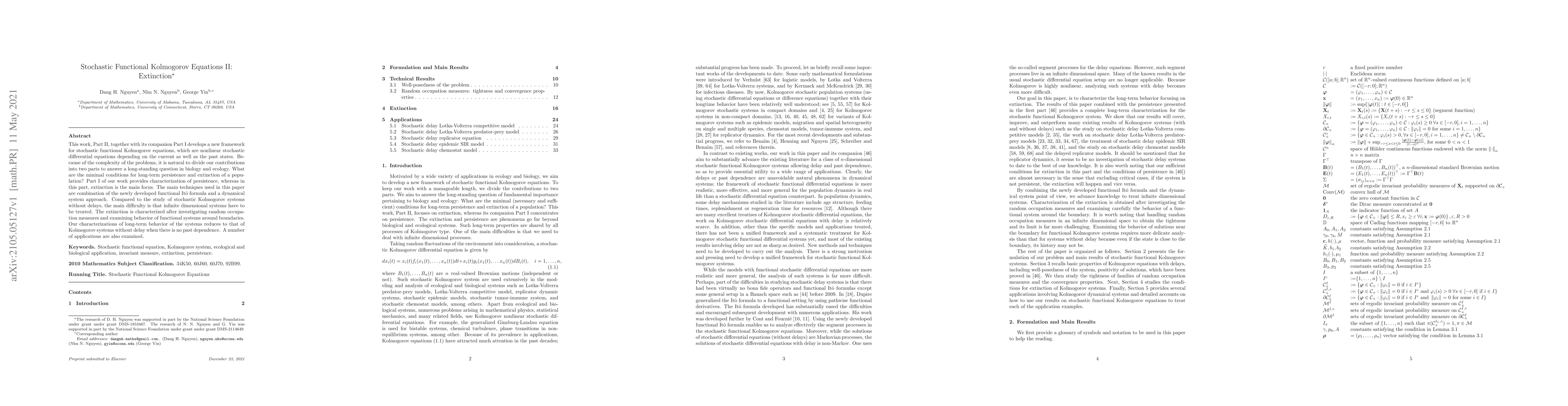 This work, Part II, together with its companion Part I develops a new framework for stochastic functional Kolmogorov equations, which are nonlinear stochastic differential equations depending on the current as well as the past states. Because of the complexity of the problems, it is natural to divide our contributions into two parts to answer a long-standing question in biology and ecology. What are the minimal conditions for long-term persistence and extinction of a population? Part I of our work provides characterization of persistence, whereas in this part, extinction is the main focus. The main techniques used in this paper are combination of the newly developed functional It^o formula and a dynamical system approach. Compared to the study of stochastic Kolmogorov systems without delays, the main difficulty is that infinite dimensional systems have to be treated. The extinction is characterized after investigating random occupation measures and examining behavior of functional systems around boundaries. Our characterizations of long-term behavior of the systems reduces to that of Kolmogorov systems without delay when there is no past dependence. A number of applications are also examined.