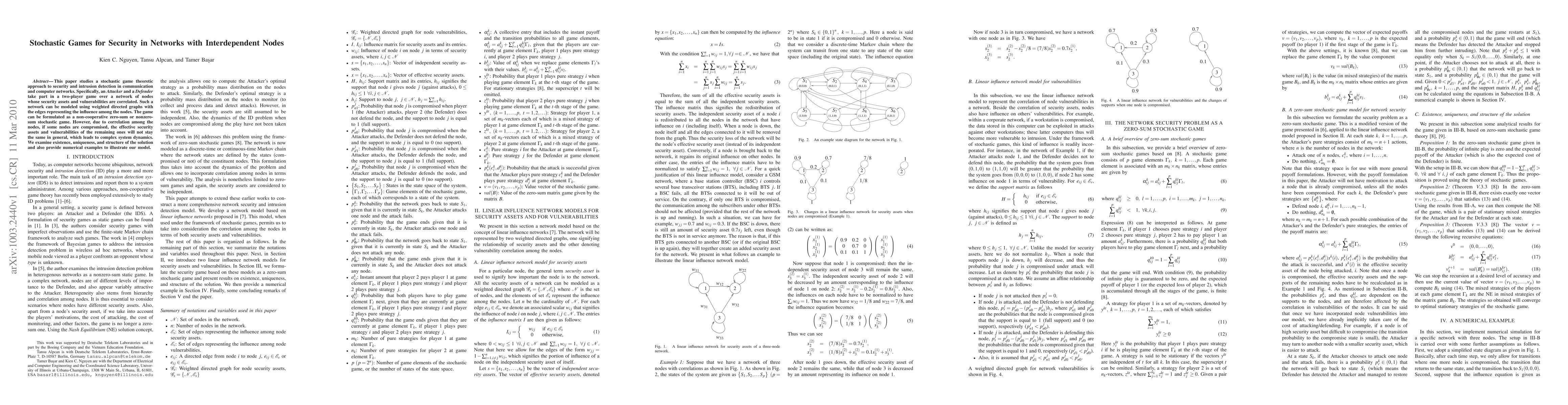 This paper studies a stochastic game theoretic approach to security and intrusion detection in communication and computer networks. Specifically, an Attacker and a Defender take part in a two-player game over a network of nodes whose security assets and vulnerabilities are correlated. Such a network can be modeled using weighted directed graphs with the edges representing the influence among the nodes. The game can be formulated as a non-cooperative zero-sum or nonzero-sum stochastic game. However, due to correlation among the nodes, if some nodes are compromised, the effective security assets and vulnerabilities of the remaining ones will not stay the same in general, which leads to complex system dynamics. We examine existence, uniqueness, and structure of the solution and also provide numerical examples to illustrate our model.