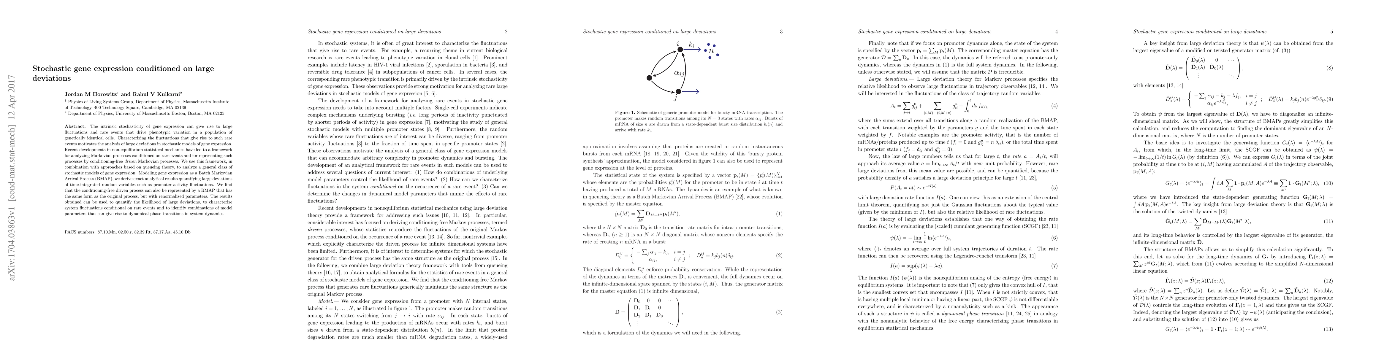 This paper analyzes stochastic gene expression models conditioned on large deviations using non-equilibrium statistical mechanics and queueing theory. It derives analytical results for a Batch Markovian Arrival Process (BMAP) representation, revealing renormalized parameters and providing insights into the likelihood of rare events and fluctuations in promoter activity.