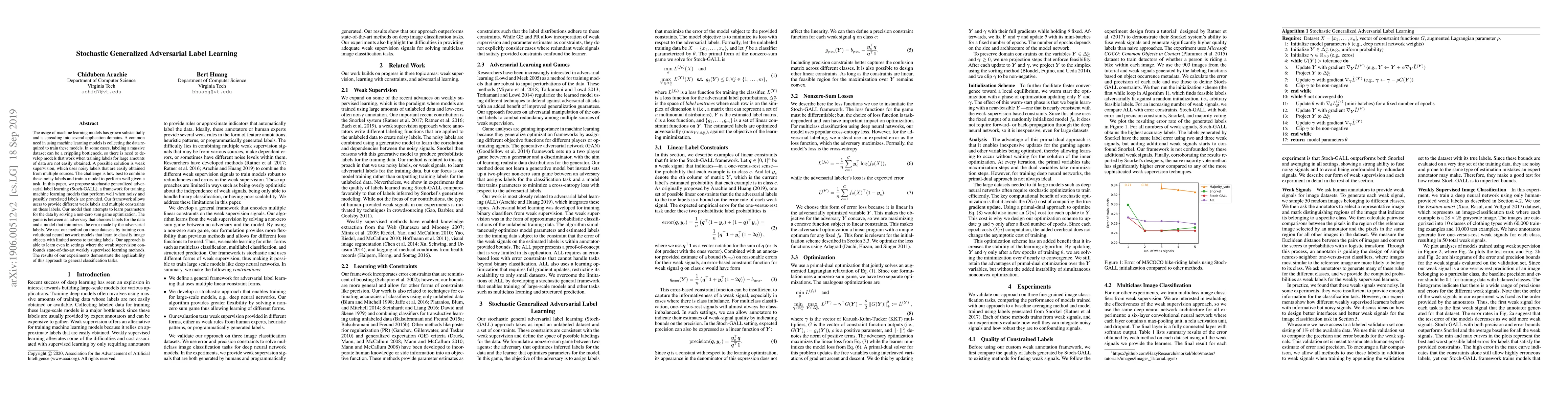 The usage of machine learning models has grown substantially and is spreading into several application domains. A common need in using machine learning models is collecting the data required to train these models. In some cases, labeling a massive dataset can be a crippling bottleneck, so there is need to develop models that work when training labels for large amounts of data are not easily obtained. A possible solution is weak supervision, which uses noisy labels that are easily obtained from multiple sources. The challenge is how best to combine these noisy labels and train a model to perform well given a task. In this paper, we propose stochastic generalized adversarial label learning (Stoch-GALL), a framework for training machine learning models that perform well when noisy and possibly correlated labels are provided. Our framework allows users to provide different weak labels and multiple constraints on these labels. Our model then attempts to learn parameters for the data by solving a non-zero sum game optimization. The game is between an adversary that chooses labels for the data and a model that minimizes the error made by the adversarial labels. We test our method on three datasets by training convolutional neural network models that learn to classify image objects with limited access to training labels. Our approach is able to learn even in settings where the weak supervision confounds state-of-the-art weakly supervised learning methods. The results of our experiments demonstrate the applicability of this approach to general classification tasks.