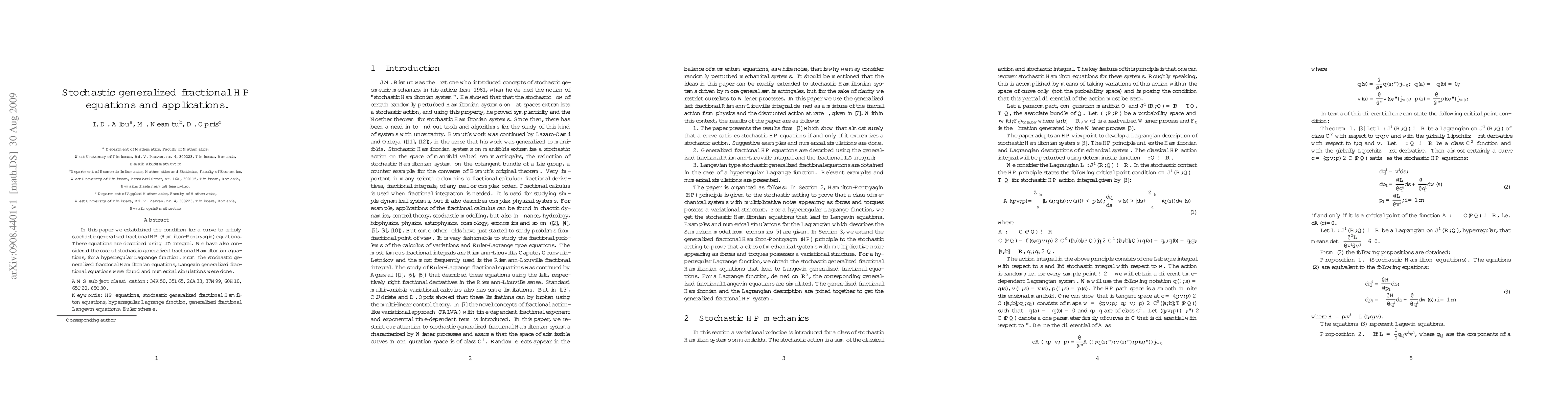 In this paper we established the condition for a curve to satisfy stochastic generalized fractional HP (Hamilton-Pontryagin) equations. These equations are described using Ito integral. We have also considered the case of stochastic generalized fractional Hamiltonian equations, for a hyperregular Lagrange function. From the stochastic generalized fractional Hamiltonian equations, Langevin generalized fractional equations were found and numerical simulations were done.