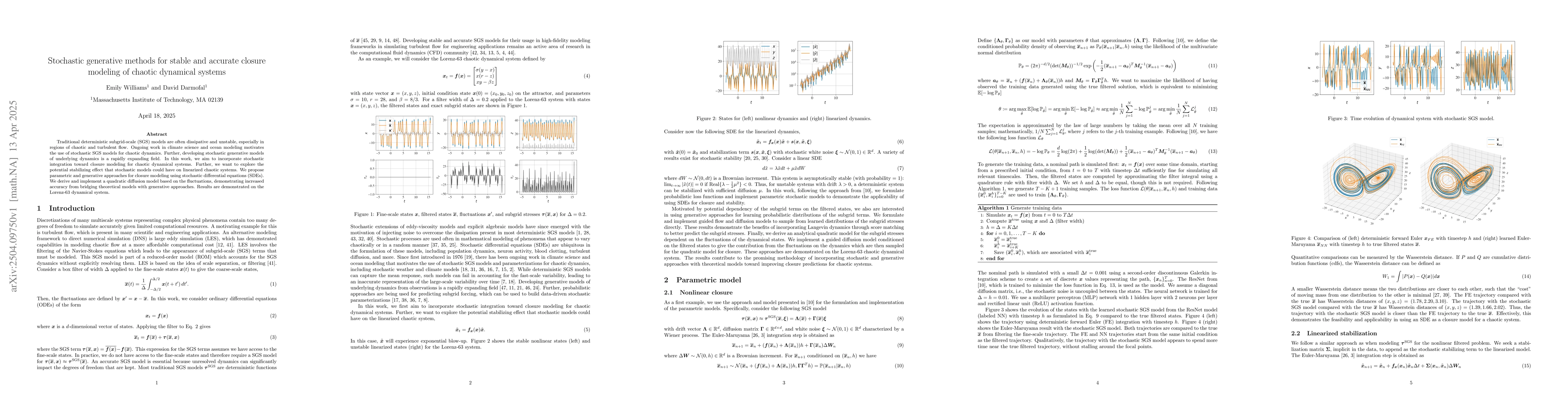 This research stands out by combining theoretical models with generative approaches for closure modeling, demonstrating improved stability and accuracy in chaotic dynamical systems through stochastic integration and generative SDEs.
