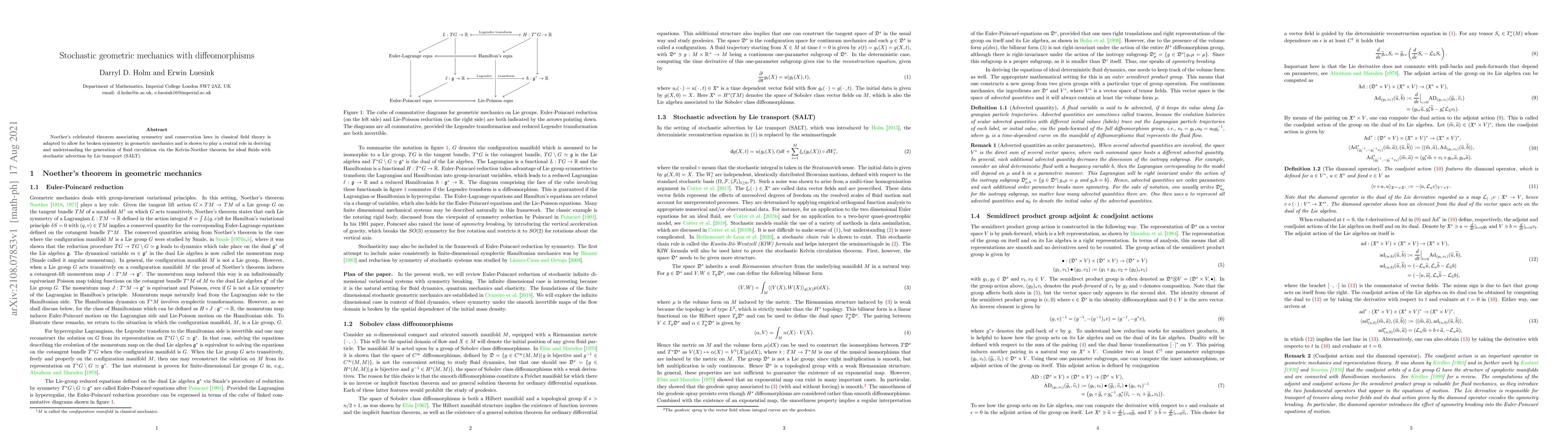 This paper extends Noether's theorem to geometric mechanics with broken symmetries, demonstrating its application in deriving fluid circulation laws for ideal fluids under stochastic advection by Lie transport (SALT). The Kelvin-Noether theorem is highlighted as a crucial tool in understanding these dynamics.