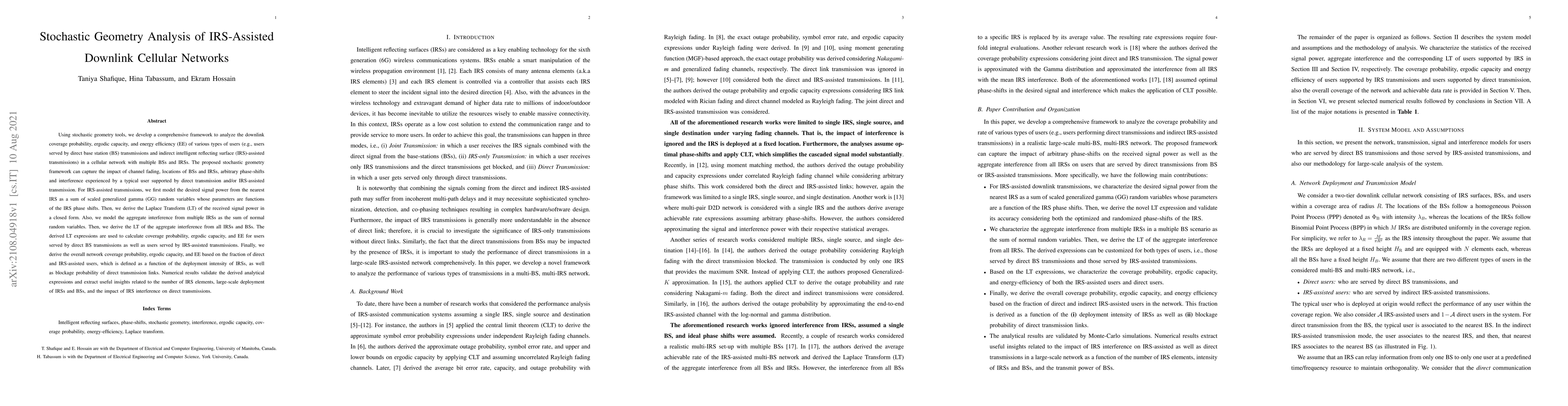 Using stochastic geometry tools, we develop a comprehensive framework to analyze the downlink coverage probability, ergodic capacity, and energy efficiency (EE) of various types of users (e.g., users served by direct base station (BS) transmissions and indirect intelligent reflecting surface (IRS)-assisted transmissions) in a cellular network with multiple BSs and IRSs. The proposed stochastic geometry framework can capture the impact of channel fading, locations of BSs and IRSs, arbitrary phase-shifts and interference experienced by a typical user supported by direct transmission and/or IRS-assisted transmission. For IRS-assisted transmissions, we first model the desired signal power from the nearest IRS as a sum of scaled generalized gamma (GG) random variables whose parameters are functions of the IRS phase shifts. Then, we derive the Laplace Transform (LT) of the received signal power in a closed form. Also, we model the aggregate interference from multiple IRSs as the sum of normal random variables. Then, we derive the LT of the aggregate interference from all IRSs and BSs. The derived LT expressions are used to calculate coverage probability, ergodic capacity, and EE for users served by direct BS transmissions as well as users served by IRS-assisted transmissions. Finally, we derive the overall network coverage probability, ergodic capacity, and EE based on the fraction of direct and IRS-assisted users, which is defined as a function of the deployment intensity of IRSs, as well as blockage probability of direct transmission links. Numerical results validate the derived analytical expressions and extract useful insights related to the number of IRS elements, large-scale deployment of IRSs and BSs, and the impact of IRS interference on direct transmissions.