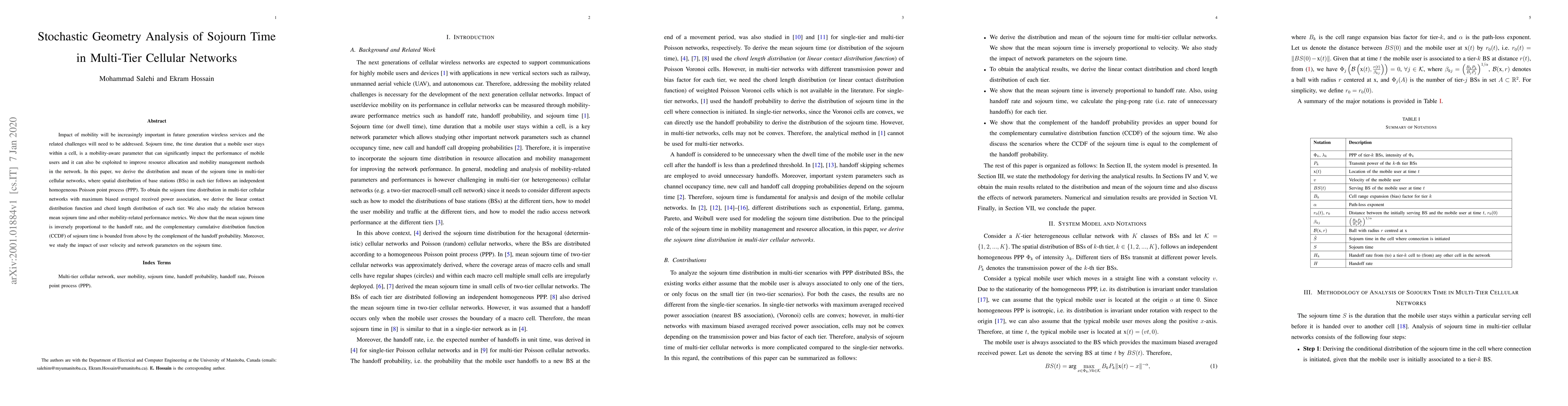 This paper derives the distribution and mean of sojourn time in multi-tier cellular networks using stochastic geometry, showing that mean sojourn time inversely correlates with the handoff rate. It also examines how user velocity and network parameters affect sojourn time, providing insights for resource allocation and mobility management.