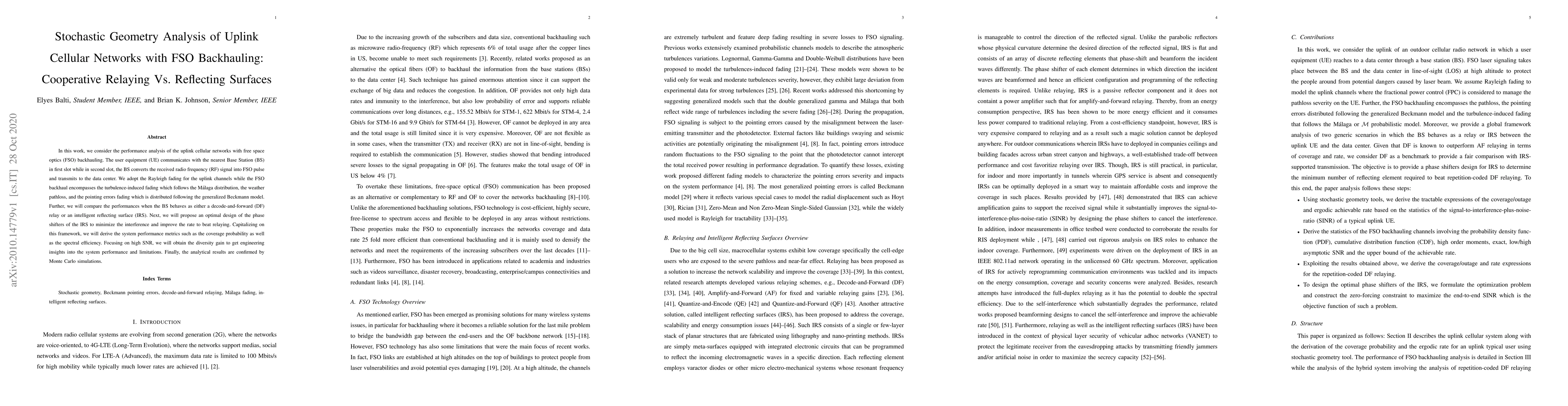 This research analyzes the performance of uplink cellular networks with FSO backhauling using cooperative relaying and intelligent reflecting surfaces, comparing their effects on coverage probability and spectral efficiency.