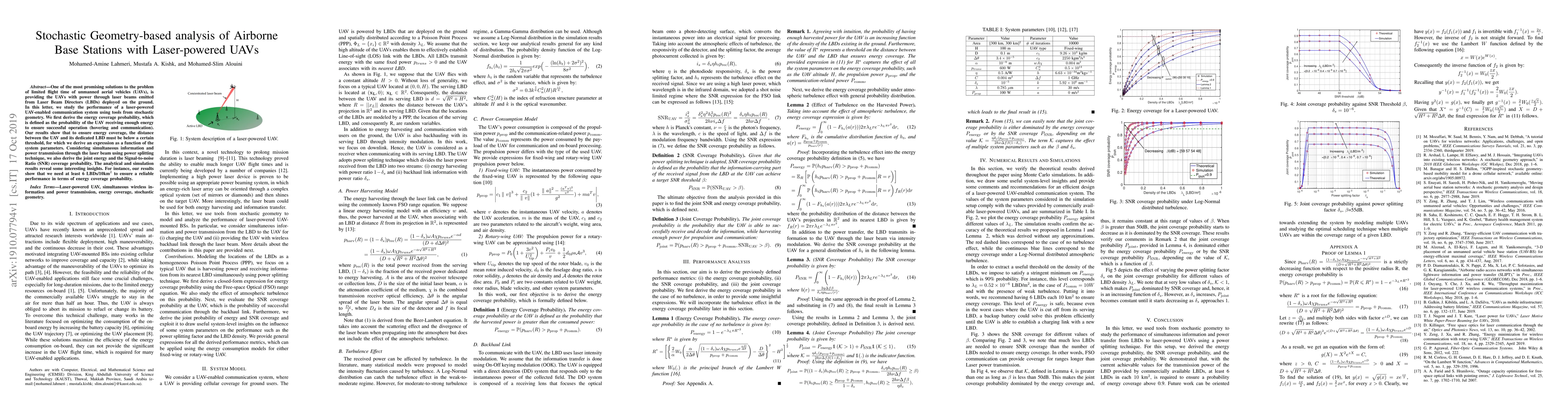 One of the most promising solutions to the problem of limited flight time of unmanned aerial vehicles (UAVs), is providing the UAVs with power through laser beams emitted from Laser Beam Directors (LBDs) deployed on the ground. In this letter, we study the performance of a laser-powered UAV-enabled communication system using tools from stochastic geometry. We first derive the energy coverage probability, which is defined as the probability of the UAV receiving enough energy to ensure successful operation (hovering and communication). Our results show that to ensure energy coverage, the distance between the UAV and its dedicated LBD must be below a certain threshold, for which we derive an expression as a function of the system parameters. Considering simultaneous information and power transmission through the laser beam using power splitting technique, we also derive the joint energy and the Signal-to-noise Ratio (SNR) coverage probability. The analytical and simulation results reveal some interesting insights. For instance, our results show that we need at least 6 LBDs/10km^2 to ensure a reliable performance in terms of energy coverage probability.