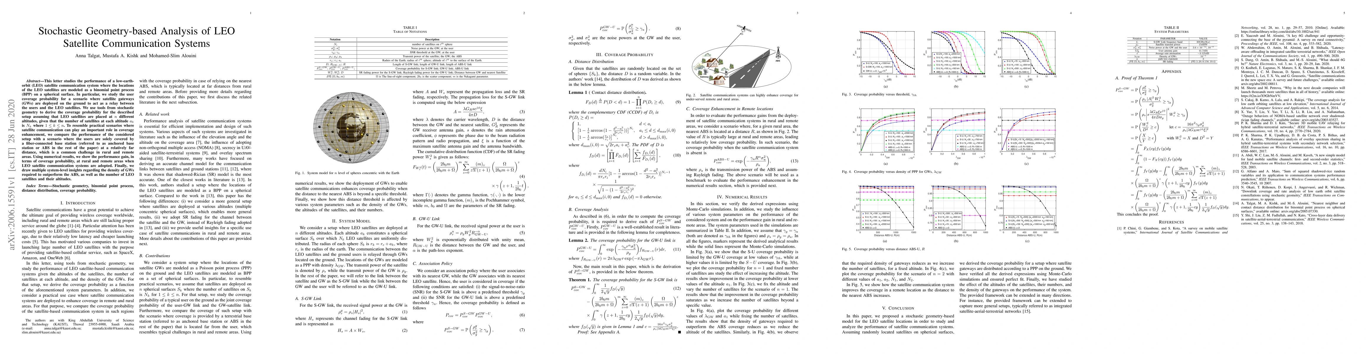 This letter studies the performance of a low-earth orbit (LEO) satellite communication system where the locations of the LEO satellites are modeled as a binomial point process (BPP) on a spherical surface. In particular, we study the user coverage probability for a scenario where satellite gateways (GWs) are deployed on the ground to act as a relay between the users and the LEO satellites. We use tools from stochastic geometry to derive the coverage probability for the described setup assuming that LEO satellites are placed at n different altitudes, given that the number of satellites at each altitude ak is Nk for all k. To resemble practical scenarios where satellite communication can play an important role in coverage enhancement, we compare the performance of the considered setup with a scenario where the users are solely covered by a fiber-connected base station (referred to as anchored base station or ABS in the rest of the paper) at a relatively far distance, which is a common challenge in rural and remote areas. Using numerical results, we show the performance gain, in terms of coverage probability, at rural and remote areas when LEO satellite communication systems are adopted. Finally, we draw multiple system-level insights regarding the density of GWs required to outperform the ABS, as well as the number of LEO satellites and their altitudes.