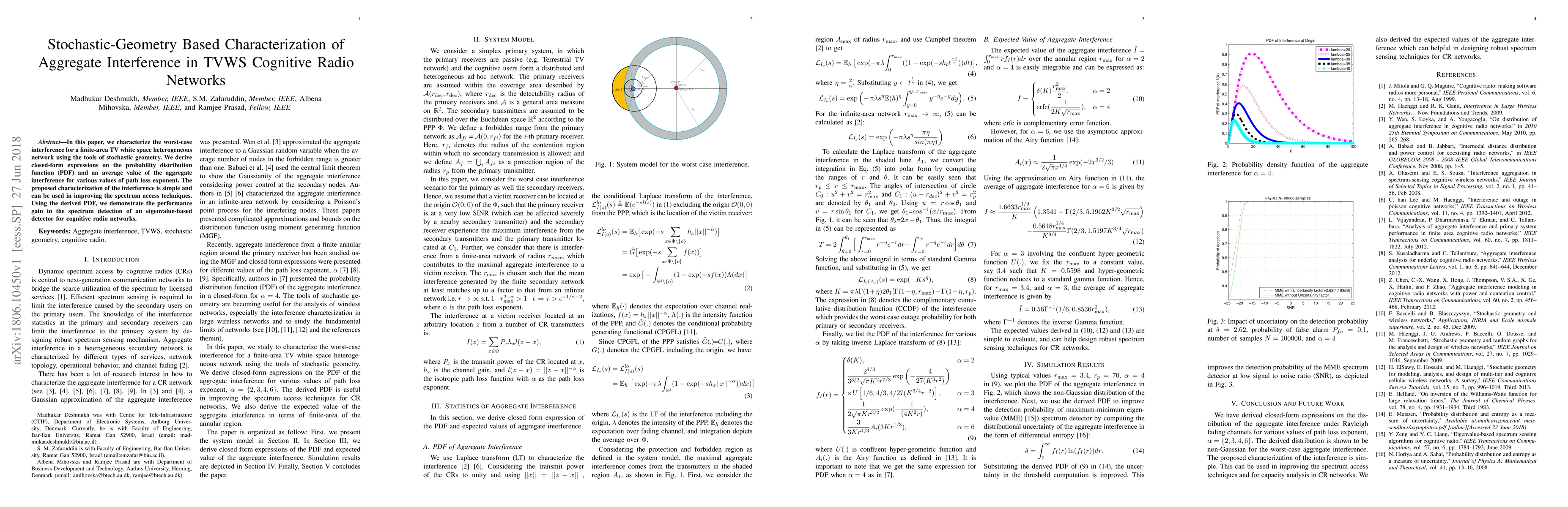 This paper uses stochastic geometry to characterize aggregate interference in TV white space cognitive radio networks, deriving closed-form expressions for the probability distribution function and average interference. The results improve spectrum access techniques and demonstrate performance gains with an eigenvalue-based detector.