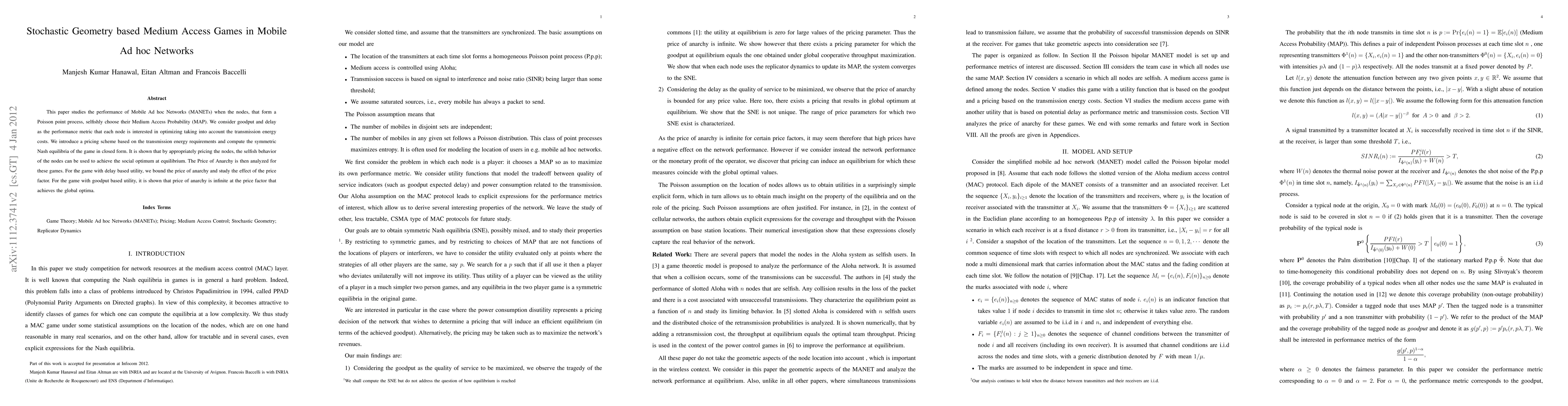 This paper examines MANETs where nodes selfishly optimize their Medium Access Probability, focusing on goodput and delay while considering energy costs. It introduces a pricing scheme to achieve social optimality at Nash equilibrium, analyzing the Price of Anarchy for both delay and goodput-based utility functions.