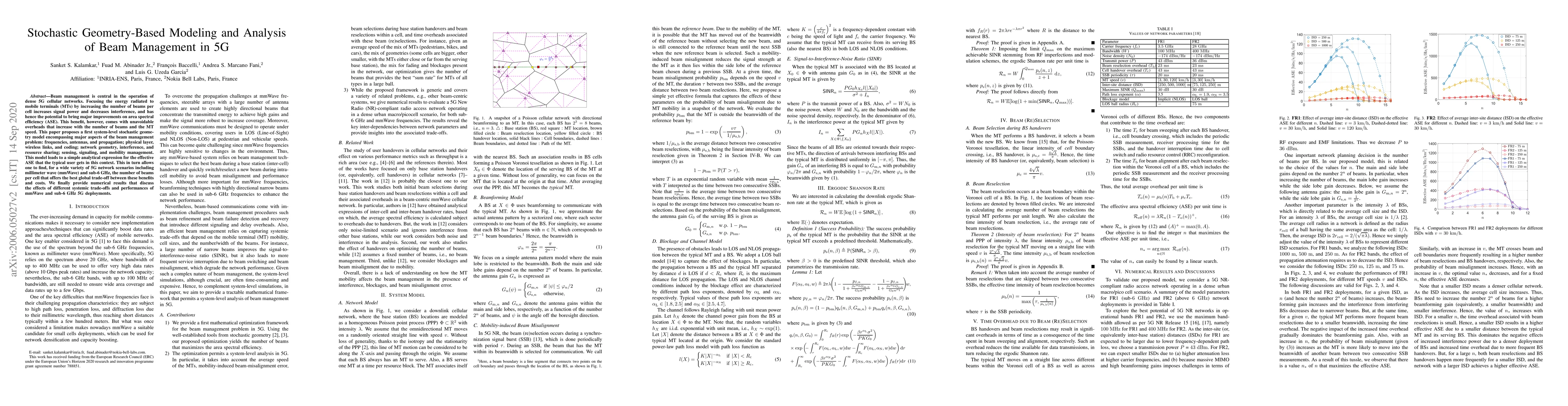 Beam management is central in the operation of dense 5G cellular networks. Focusing the energy radiated to mobile terminals (MTs) by increasing the number of beams per cell increases signal power and decreases interference, and has hence the potential to bring major improvements on area spectral efficiency (ASE). This benefit, however, comes with unavoidable overheads that increase with the number of beams and the MT speed. This paper proposes a first system-level stochastic geometry model encompassing major aspects of the beam management problem: frequencies, antennas, and propagation; physical layer, wireless links, and coding; network geometry, interference, and resource sharing; sensing, signaling, and mobility management. This model leads to a simple analytical expression for the effective ASE that the typical user gets in this context. This in turn allows one to find, for a wide variety of 5G network scenarios including millimeter wave (mmWave) and sub-6 GHz, the number of beams per cell that offers the best global trade-off between these benefits and costs. We finally provide numerical results that discuss the effects of different systemic trade-offs and performances of mmWave and sub-6 GHz 5G deployments.