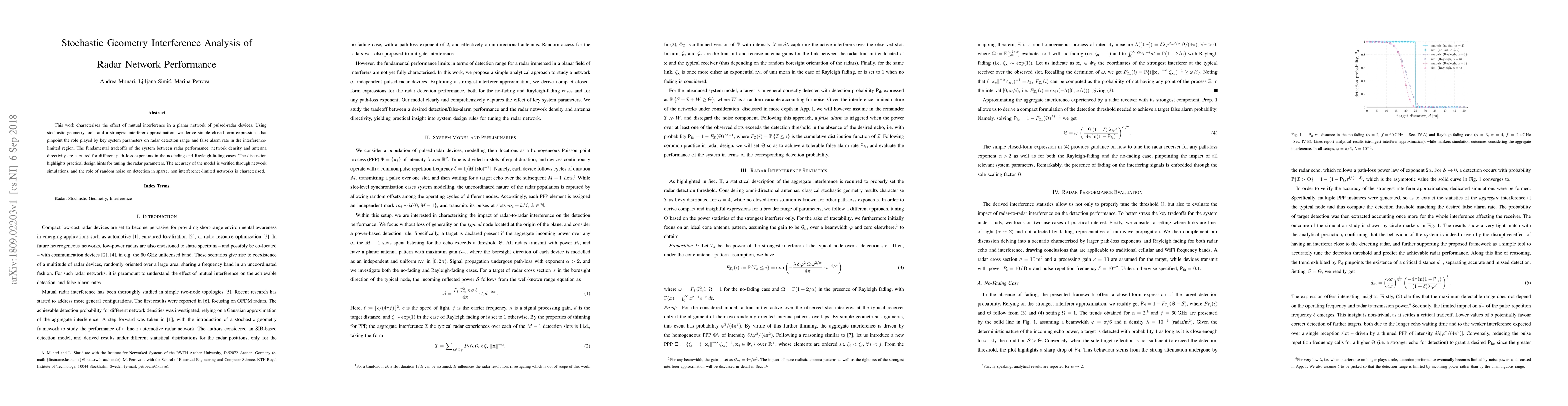 This paper uses stochastic geometry to analyze interference in a radar network, deriving closed-form expressions for radar detection range and false alarm rate under various conditions. Practical design insights and model accuracy are validated through simulations.