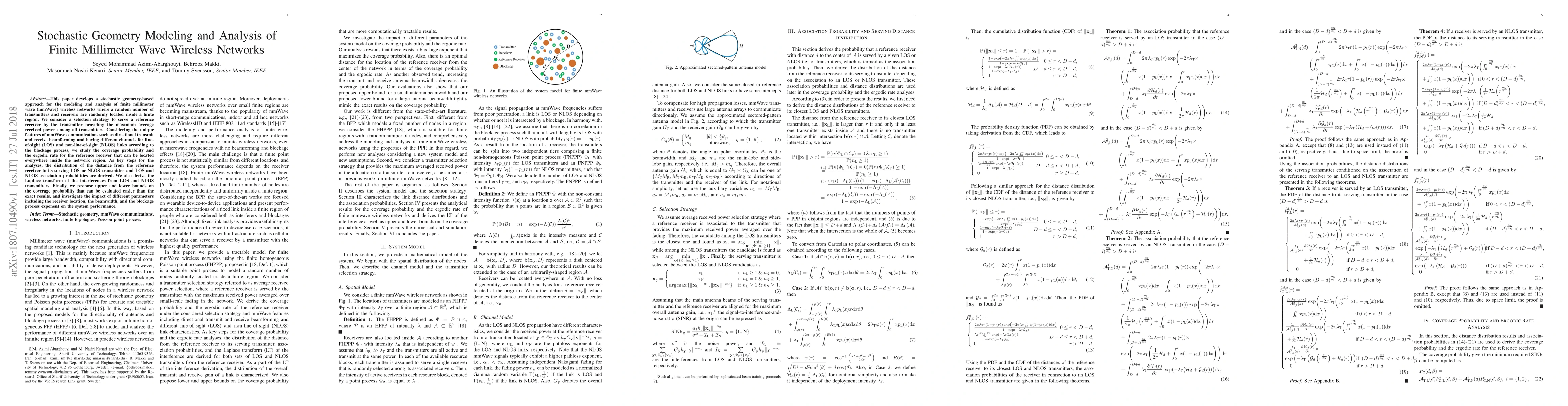 This paper employs stochastic geometry to model and analyze finite millimeter wave wireless networks, focusing on coverage probability and ergodic rate under directional beamforming and LOS/NLOS distinctions. It derives bounds on coverage probability and examines the impact of various parameters on system performance.