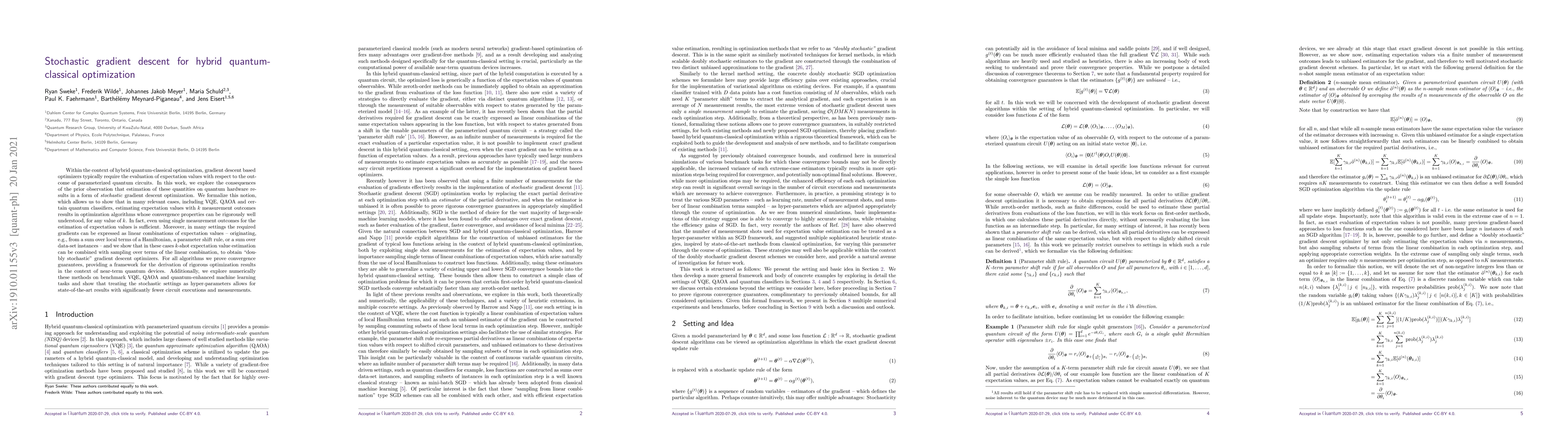This paper formalizes the stochastic gradient descent optimization in hybrid quantum-classical optimization, demonstrating that estimating expectation values with limited measurements can yield rigorous convergence guarantees. It introduces "doubly stochastic" gradient descent methods and shows they achieve state-of-the-art results with fewer quantum resources, applicable to VQE, QAOA, and quantum classifiers.