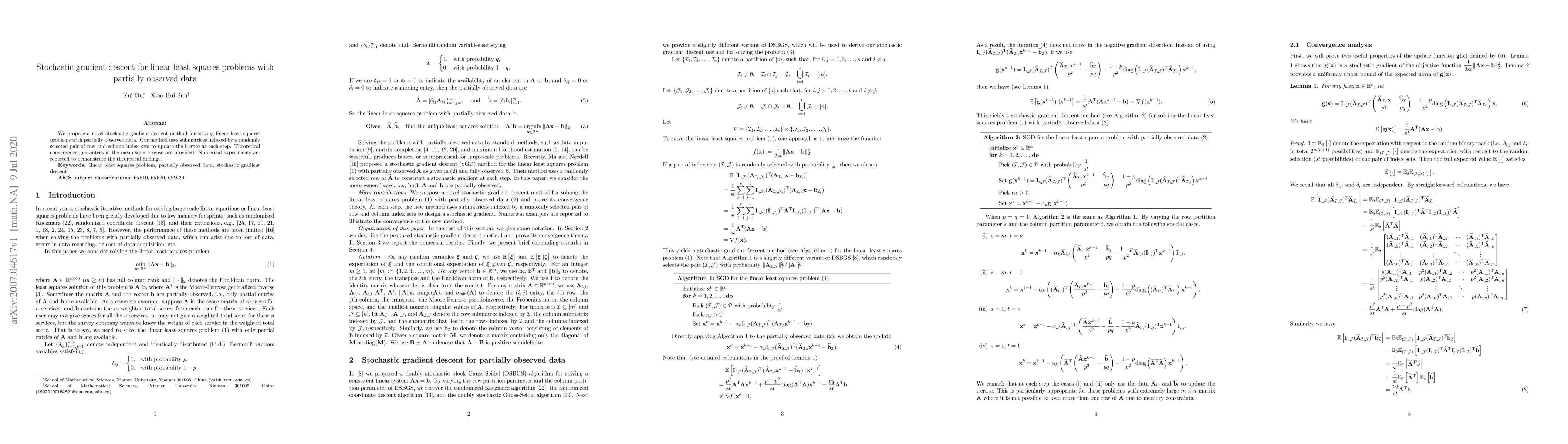 The paper introduces a novel stochastic gradient descent technique for linear least squares problems with incomplete data, employing randomly selected submatrices for iterative updates, and provides theoretical convergence guarantees along with numerical validation.