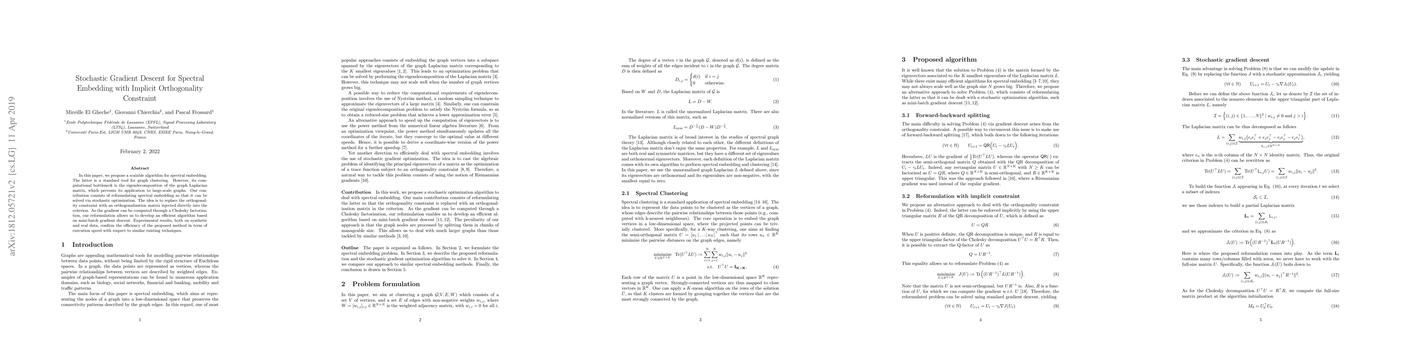 In this paper, we propose a scalable algorithm for spectral embedding. The latter is a standard tool for graph clustering. However, its computational bottleneck is the eigendecomposition of the graph Laplacian matrix, which prevents its application to large-scale graphs. Our contribution consists of reformulating spectral embedding so that it can be solved via stochastic optimization. The idea is to replace the orthogonality constraint with an orthogonalization matrix injected directly into the criterion. As the gradient can be computed through a Cholesky factorization, our reformulation allows us to develop an efficient algorithm based on mini-batch gradient descent. Experimental results, both on synthetic and real data, confirm the efficiency of the proposed method in term of execution speed with respect to similar existing techniques.