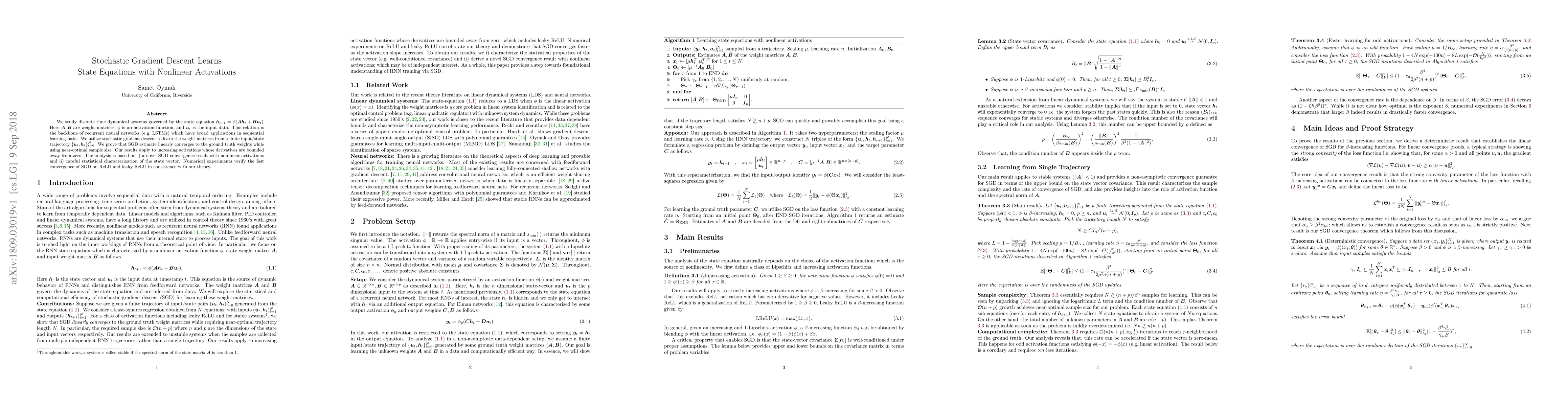 This paper investigates the use of stochastic gradient descent (SGD) to learn the weight matrices in state equations of discrete time dynamical systems with nonlinear activations. The authors prove that SGD converges linearly to the true weights with near-optimal sample size, and numerical experiments confirm the theoretical findings using ReLU and leaky ReLU activations.
