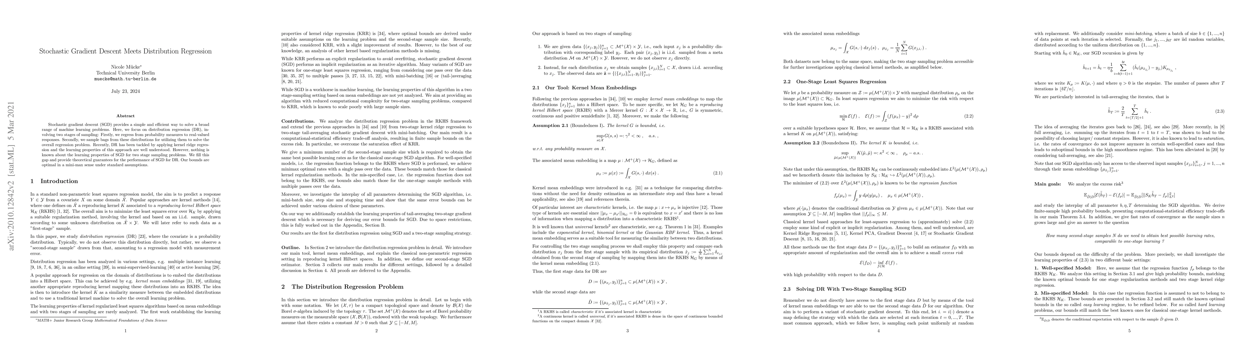 This paper investigates the application of stochastic gradient descent (SGD) for distribution regression (DR), which involves two stages of sampling. It provides theoretical guarantees for SGD's performance in DR, demonstrating optimal mini-max bounds under standard assumptions, filling a gap in understanding SGD's learning properties for such problems.
