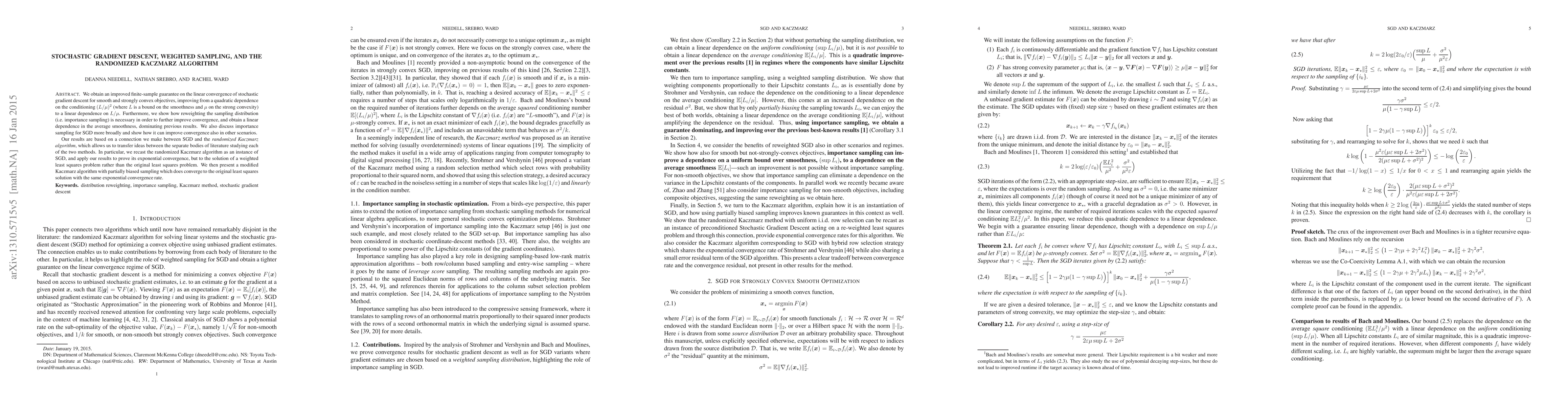 This paper improves the convergence rate of stochastic gradient descent (SGD) for smooth and strongly convex problems, reducing the dependence on problem conditioning from quadratic to linear. It also introduces weighted sampling techniques to further enhance convergence, drawing connections between SGD and the randomized Kaczmarz algorithm to achieve exponential convergence for a weighted least squares problem.