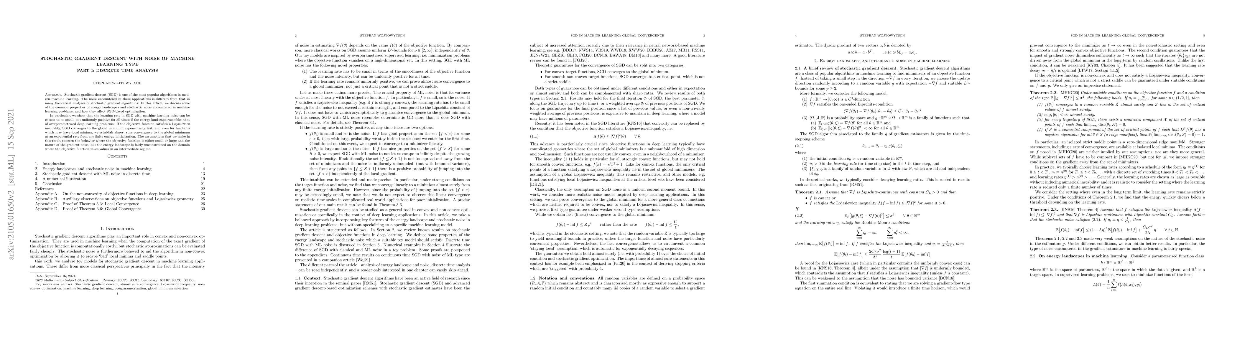 Stochastic gradient descent (SGD) is one of the most popular algorithms in modern machine learning. The noise encountered in these applications is different from that in many theoretical analyses of stochastic gradient algorithms. In this article, we discuss some of the common properties of energy landscapes and stochastic noise encountered in machine learning problems, and how they affect SGD-based optimization. In particular, we show that the learning rate in SGD with machine learning noise can be chosen to be small, but uniformly positive for all times if the energy landscape resembles that of overparametrized deep learning problems. If the objective function satisfies a Lojasiewicz inequality, SGD converges to the global minimum exponentially fast, and even for functions which may have local minima, we establish almost sure convergence to the global minimum at an exponential rate from any finite energy initialization. The assumptions that we make in this result concern the behavior where the objective function is either small or large and the nature of the gradient noise, but the energy landscape is fairly unconstrained on the domain where the objective function takes values in an intermediate regime.
