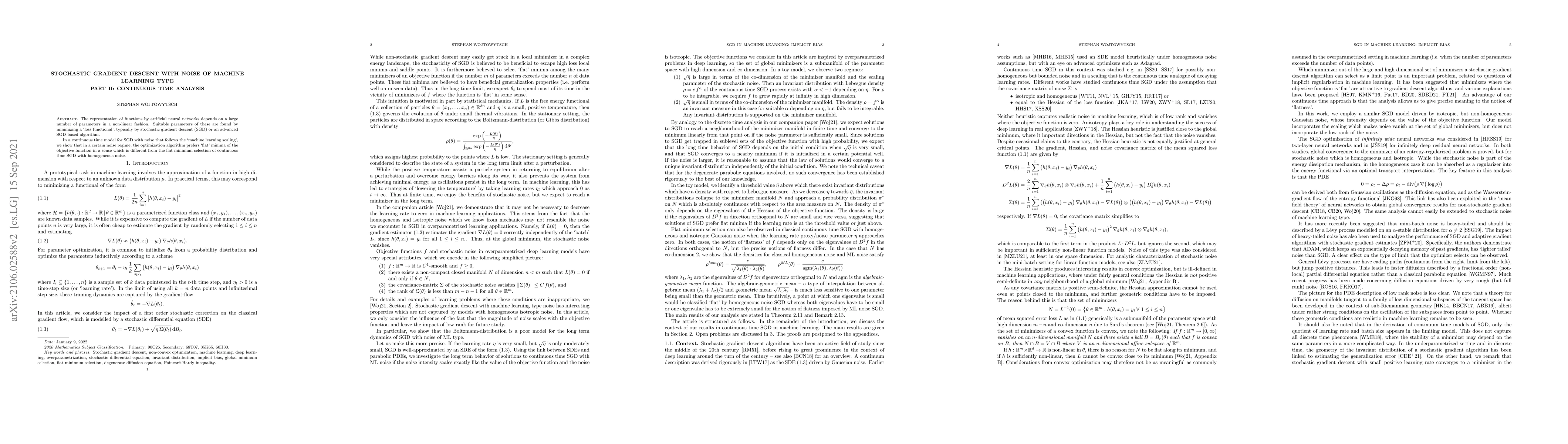 The representation of functions by artificial neural networks depends on a large number of parameters in a non-linear fashion. Suitable parameters of these are found by minimizing a 'loss functional', typically by stochastic gradient descent (SGD) or an advanced SGD-based algorithm. In a continuous time model for SGD with noise that follows the 'machine learning scaling', we show that in a certain noise regime, the optimization algorithm prefers 'flat' minima of the objective function in a sense which is different from the flat minimum selection of continuous time SGD with homogeneous noise.