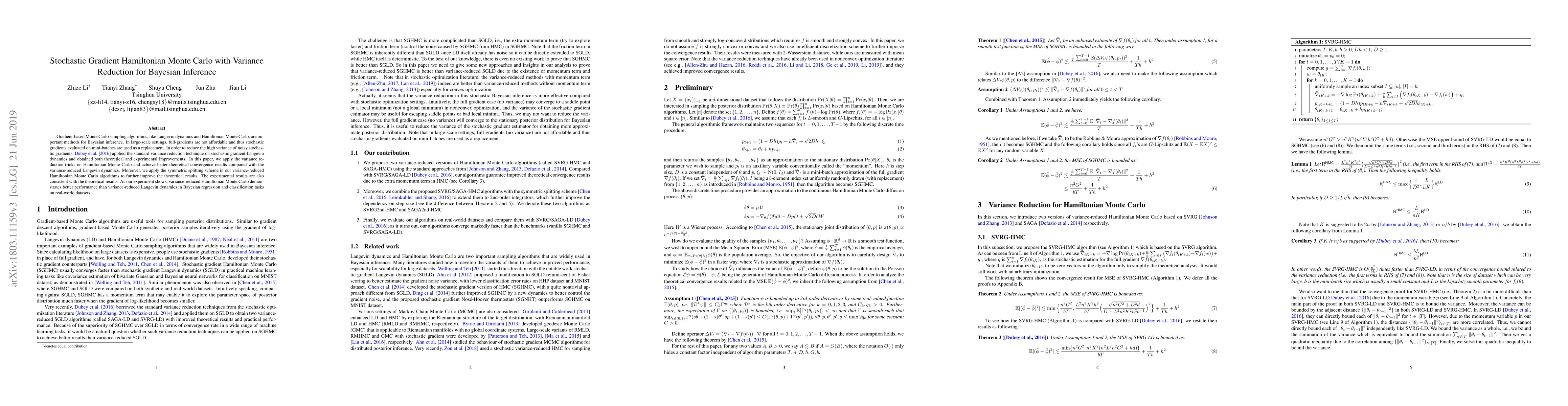 This paper introduces variance reduction techniques to stochastic gradient Hamiltonian Monte Carlo (HMC) for Bayesian inference, achieving improved theoretical convergence and practical performance over variance-reduced Langevin dynamics, especially in large-scale Bayesian regression and classification tasks.