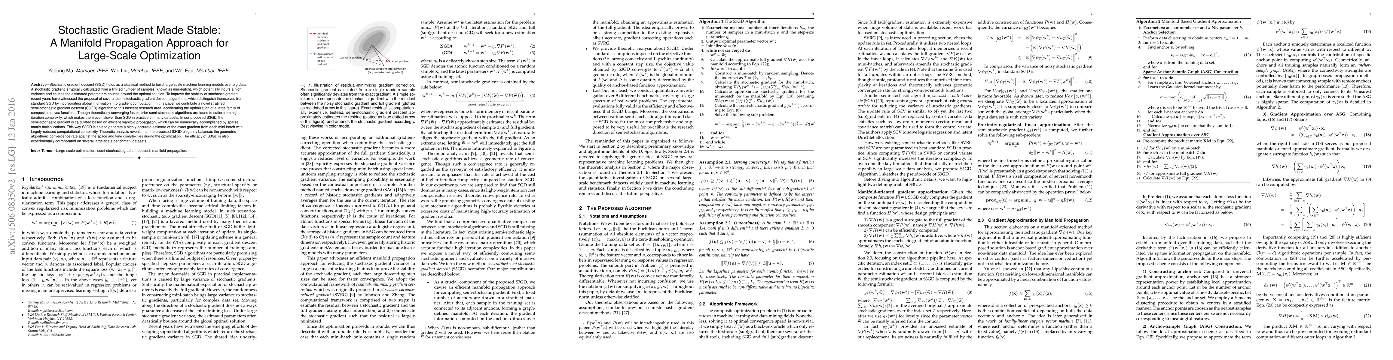 This paper introduces a novel stratified semi-stochastic gradient descent (S3GD) algorithm that enhances the stability of stochastic gradient descent (SGD) by incorporating global information through efficient manifold propagation. The S3GD algorithm achieves faster convergence and reduced computational complexity compared to existing semi-stochastic methods, as demonstrated through theoretical analysis and empirical results on large-scale datasets.