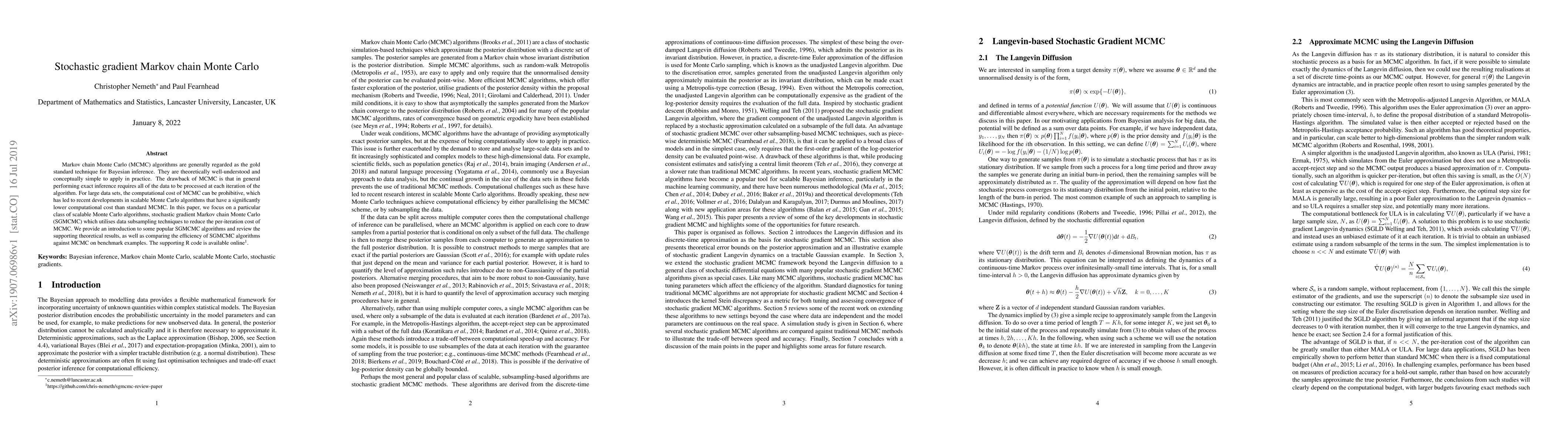 This paper introduces stochastic gradient Markov chain Monte Carlo (SGMCMC) algorithms, which utilize subsampling to reduce computational costs in Bayesian inference. It reviews popular SGMCMC methods, compares their efficiency against traditional MCMC, and provides R code for implementation.