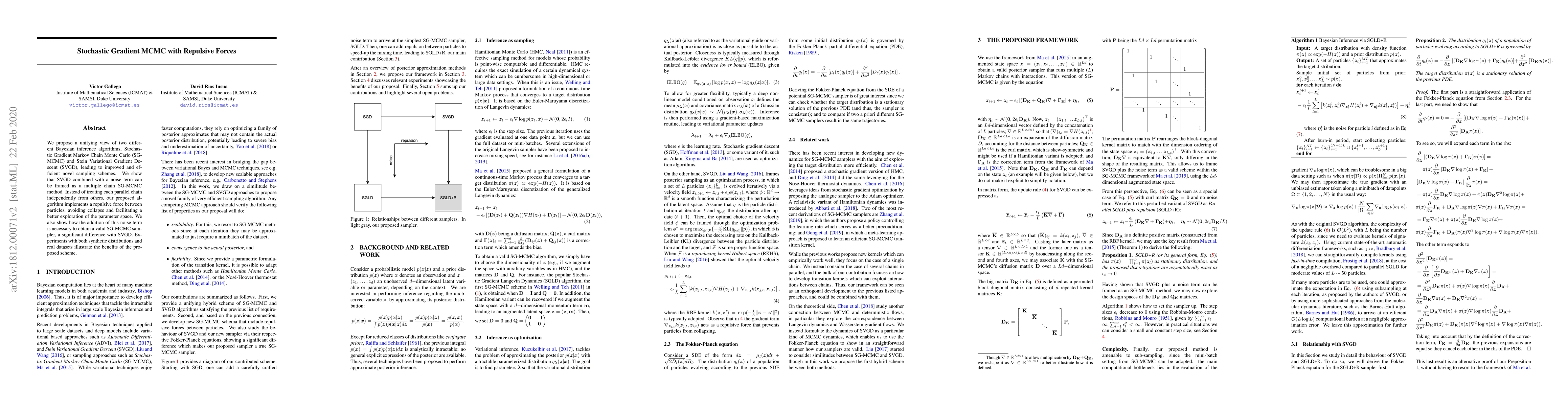 We propose a unifying view of two different Bayesian inference algorithms, Stochastic Gradient Markov Chain Monte Carlo (SG-MCMC) and Stein Variational Gradient Descent (SVGD), leading to improved and efficient novel sampling schemes. We show that SVGD combined with a noise term can be framed as a multiple chain SG-MCMC method. Instead of treating each parallel chain independently from others, our proposed algorithm implements a repulsive force between particles, avoiding collapse and facilitating a better exploration of the parameter space. We also show how the addition of this noise term is necessary to obtain a valid SG-MCMC sampler, a significant difference with SVGD. Experiments with both synthetic distributions and real datasets illustrate the benefits of the proposed scheme.