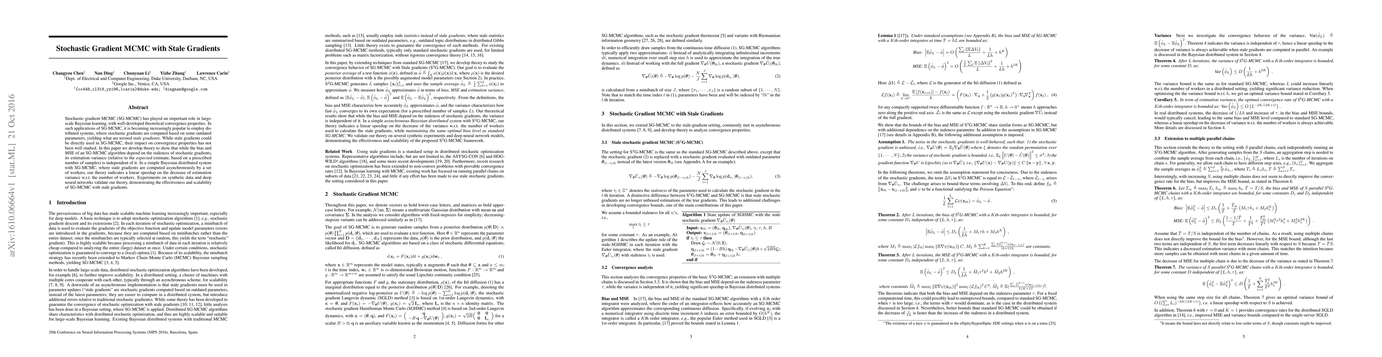 This paper develops theoretical insights into Stochastic Gradient MCMC (SG-MCMC) with stale gradients, demonstrating that while bias and MSE depend on gradient staleness, estimation variance remains unaffected. Experiments show linear speedup in variance reduction with more workers, validating the effectiveness of SG-MCMC in distributed systems.