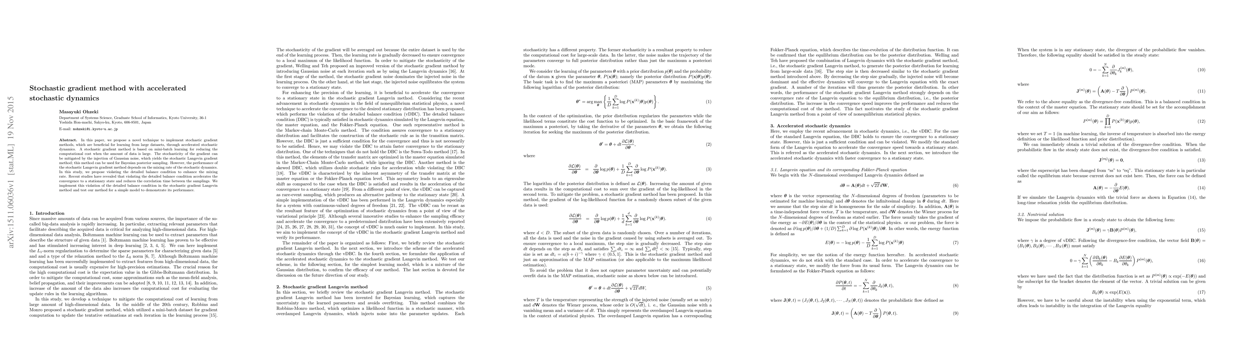 This paper proposes a novel stochastic gradient method that enhances the mixing rate and convergence speed using accelerated stochastic dynamics by violating the detailed balance condition, thereby improving the efficiency of learning from large datasets. The method is tested on a simple model to demonstrate its improved performance.