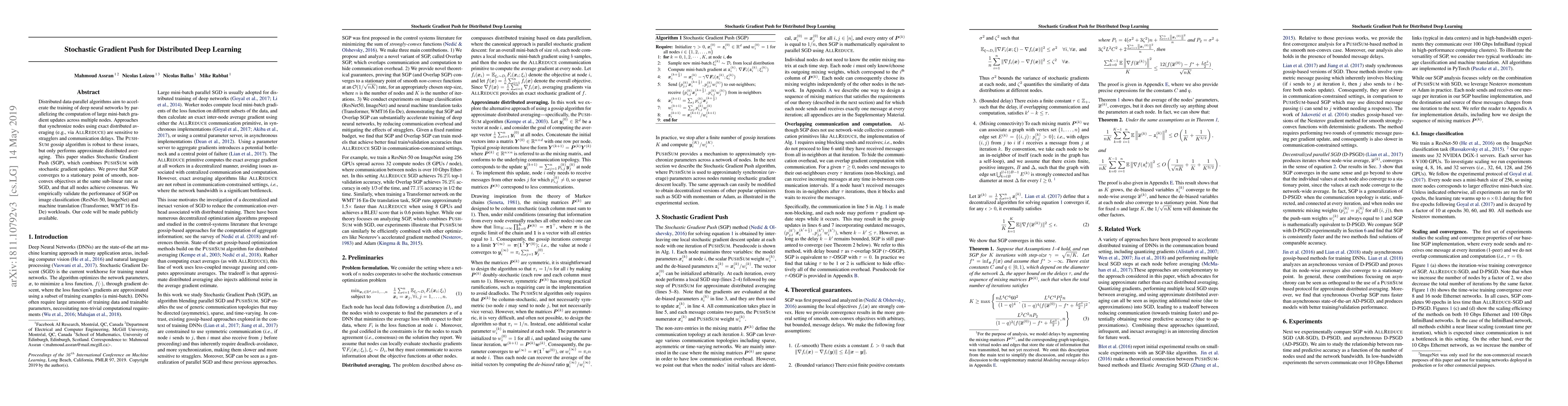 This paper introduces Stochastic Gradient Push (SGP), a method combining PushSum gossip averaging with stochastic gradient updates for distributed deep learning. It demonstrates SGP's convergence to a stationary point and consensus among nodes, validated through image classification and machine translation tasks.