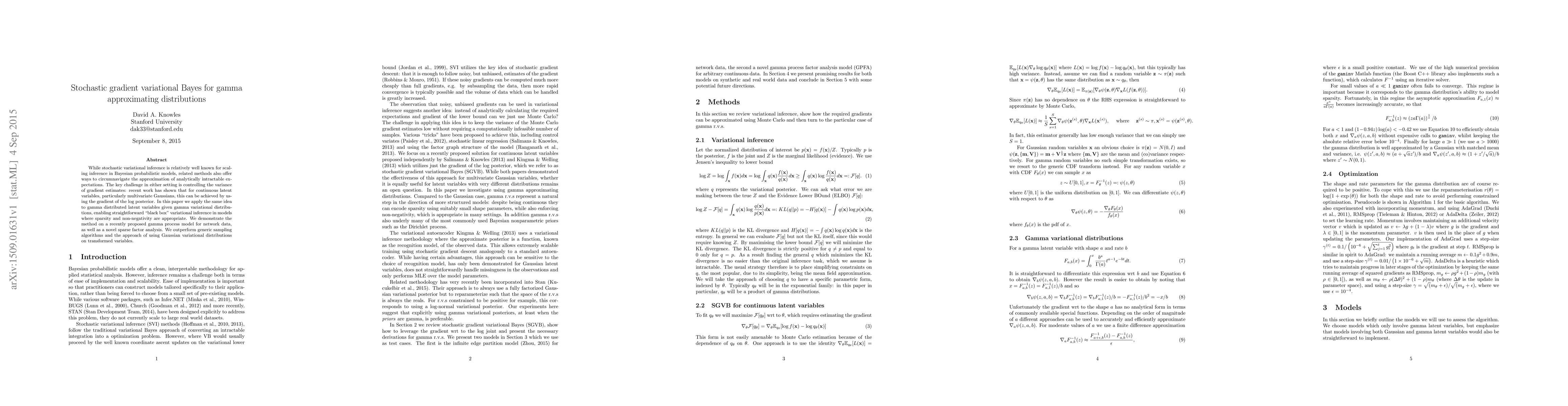 This paper introduces stochastic gradient variational Bayes for gamma approximating distributions, enabling efficient variational inference for models with sparse and non-negative latent variables. The method outperforms traditional sampling and Gaussian variational approximations, demonstrated through applications to a gamma process model and sparse factor analysis.