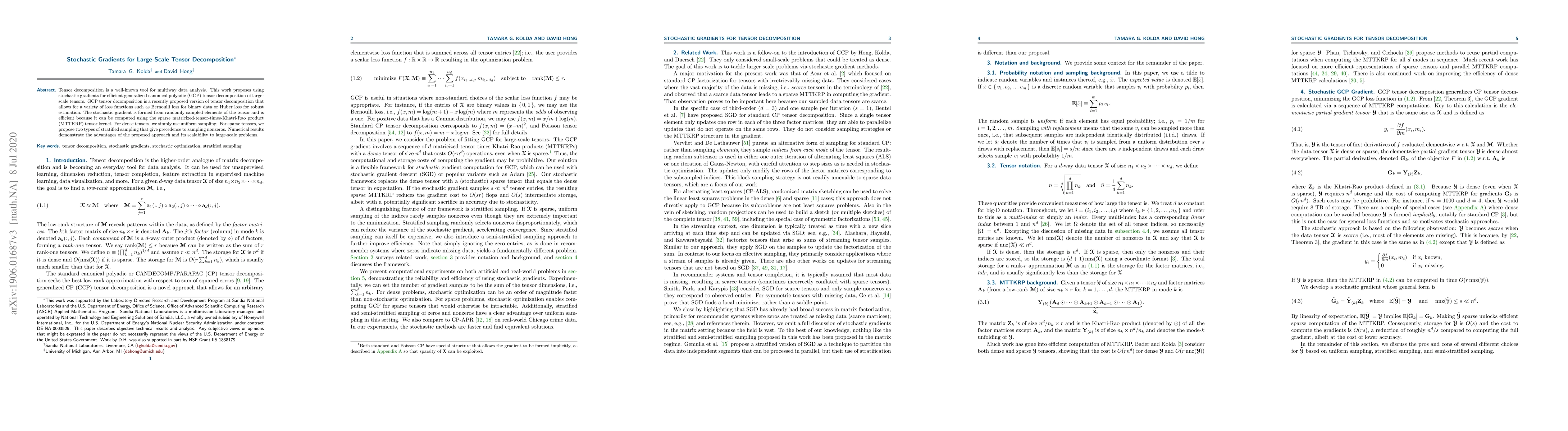 This paper proposes a method for efficiently performing generalized canonical polyadic tensor decomposition on large-scale tensors using stochastic gradients, which leverages random sampling and the sparse matricized-tensor-times-Khatri-Rao product for computation. The approach scales well and is demonstrated to be effective through numerical results.