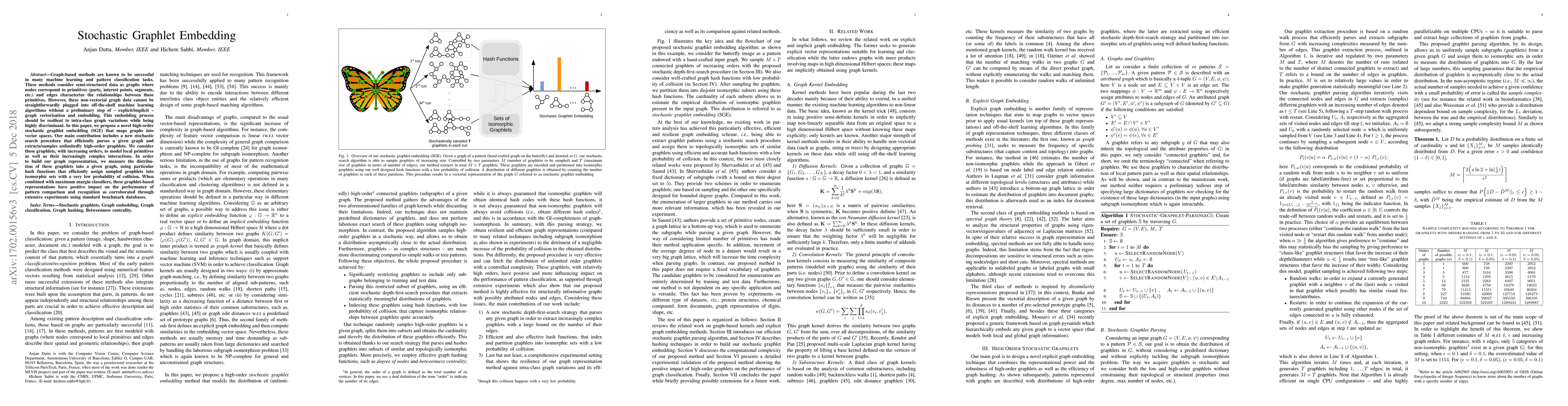 This paper introduces a novel stochastic graphlet embedding (SGE) method for mapping graphs into vector spaces, enabling effective machine learning on graph data. The proposed method efficiently extracts high-order graphlets using a stochastic search procedure, and uses hash functions to minimize collisions, enhancing pattern comparison and recognition performance.