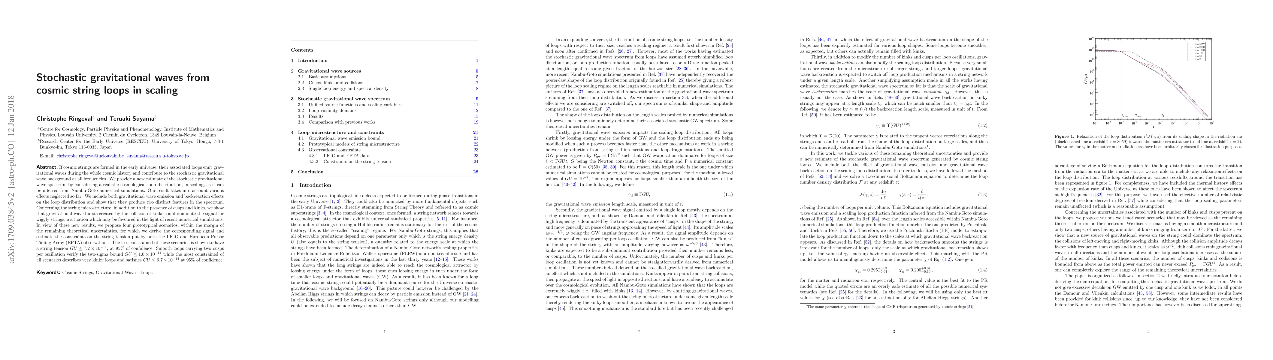 This paper estimates the stochastic gravitational wave background from cosmic string loops, incorporating detailed loop dynamics and emission effects. It proposes four scenarios with varying loop characteristics and string tensions, deriving constraints from LIGO and EPTA observations, with the least constrained scenario yielding a string tension limit of GU < 7.2 x 10^{-11} at 95% confidence.