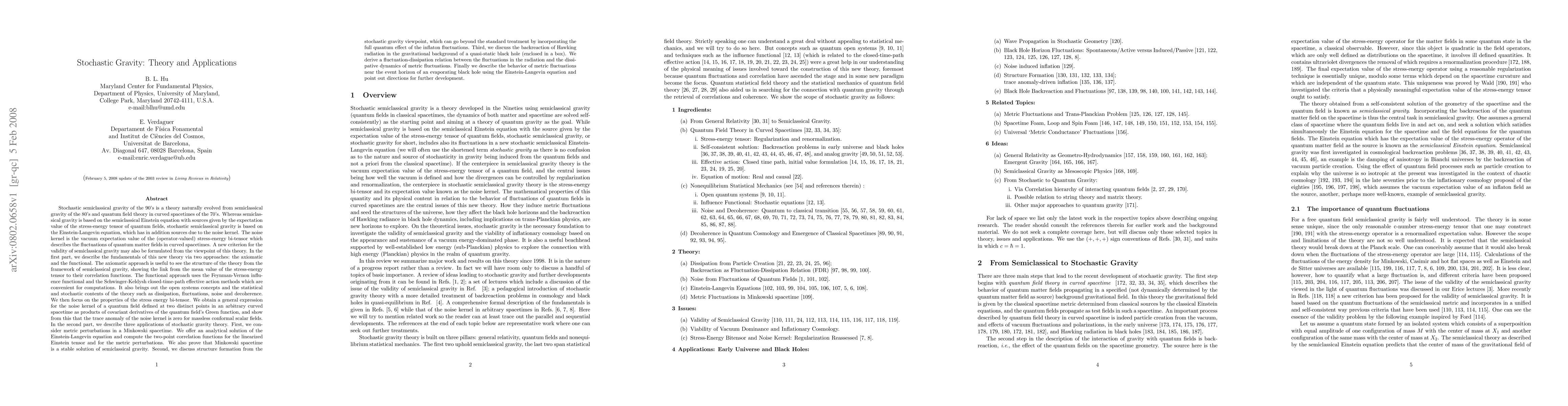 This paper introduces stochastic semiclassical gravity, contrasting it with semiclassical gravity, and explores its foundational theories and applications, including stability of Minkowski spacetime, structure formation, and backreaction of Hawking radiation near a black hole's event horizon.