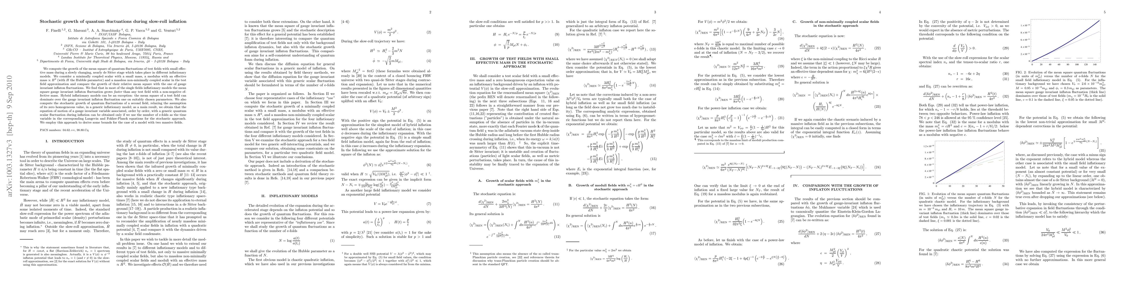 We compute the growth of the mean square of quantum fluctuations of test fields with small effective mass during a slowly changing, nearly de Sitter stage which took place in different inflationary models. We consider a minimally coupled scalar with a small mass, a modulus with an effective mass $ \propto H^2$ (with $H$ as the Hubble parameter) and a massless non-minimally coupled scalar in the test field approximation and compare the growth of their relative mean square with the one of gauge-invariant inflaton fluctuations. We find that in most of the single field inflationary models the mean square gauge invariant inflaton fluctuation grows {\em faster} than any test field with a non-negative effective mass. Hybrid inflationary models can be an exception: the mean square of a test field can dominate over the gauge invariant inflaton fluctuation one on suitably choosing parameters. We also compute the stochastic growth of quantum fluctuation of a second field, relaxing the assumption of its zero homogeneous value, in a generic inflationary model; as a main result, we obtain that the equation of motion of a gauge invariant variable associated, order by order, with a generic quantum scalar fluctuation during inflation can be obtained only if we use the number of e-folds as the time variable in the corresponding Langevin and Fokker-Planck equations for the stochastic approach. We employ this approach to derive some bounds in the case of a model with two massive fields.