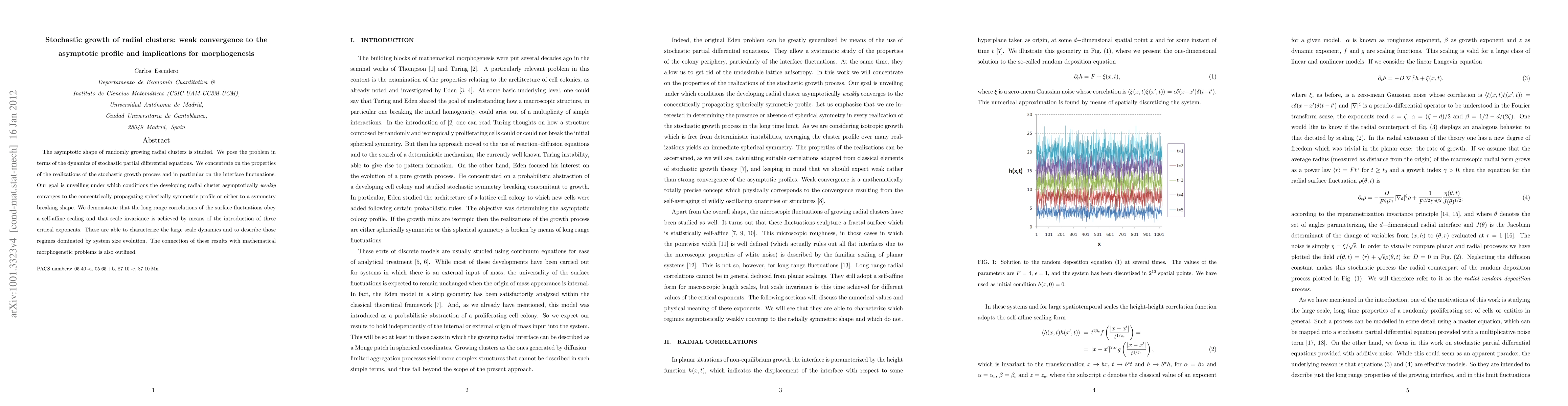 The asymptotic shape of randomly growing radial clusters is studied. We pose the problem in terms of the dynamics of stochastic partial differential equations. We concentrate on the properties of the realizations of the stochastic growth process and in particular on the interface fluctuations. Our goal is unveiling under which conditions the developing radial cluster asymptotically weakly converges to the concentrically propagating spherically symmetric profile or either to a symmetry breaking shape. We demonstrate that the long range correlations of the surface fluctuations obey a self-affine scaling and that scale invariance is achieved by means of the introduction of three critical exponents. These are able to characterize the large scale dynamics and to describe those regimes dominated by system size evolution. The connection of these results with mathematical morphogenetic problems is also outlined.