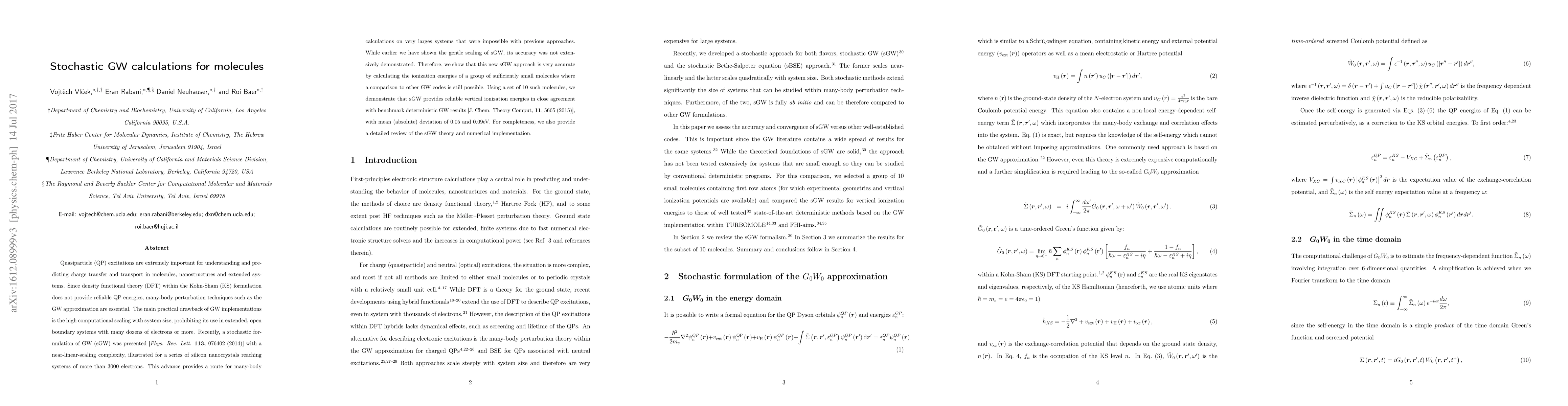 Quasiparticle (QP) excitations are extremely important for understanding and predicting charge transfer and transport in molecules, nanostructures and extended systems. Since density functional theory (DFT) within the Kohn-Sham (KS) formulation does not provide reliable QP energies, many-body perturbation techniques such as the GW approximation are essential. The main practical drawback of GW implementations is the high computational scaling with system size, prohibiting its use in extended, open boundary systems with many dozens of electrons or more. Recently, a stochastic formulation of GW (sGW) was presented [Phys. Rev. Lett. 113, 076402 (2014)] with a near-linear-scaling complexity, illustrated for a series of silicon nanocrystals reaching systems of more than 3000 electrons. This advance provides a route for many-body calculations on very larges systems that were impossible with previous approaches. While earlier we have shown the gentle scaling of sGW, its accuracy was not extensively demonstrated. Therefore, we show that this new sGW approach is very accurate by calculating the ionization energies of a group of sufficiently small molecules where a comparison to other GW codes is still possible. Using a set of 10 such molecules, we demonstrate that sGW provides reliable vertical ionization energies in close agreement with benchmark deterministic GW results [J. Chem. Theory Comput, 11, 5665 (2015)], with mean (absolute) deviation of 0.05 and 0.09eV. For completeness, we also provide a detailed review of the sGW theory and numerical implementation.