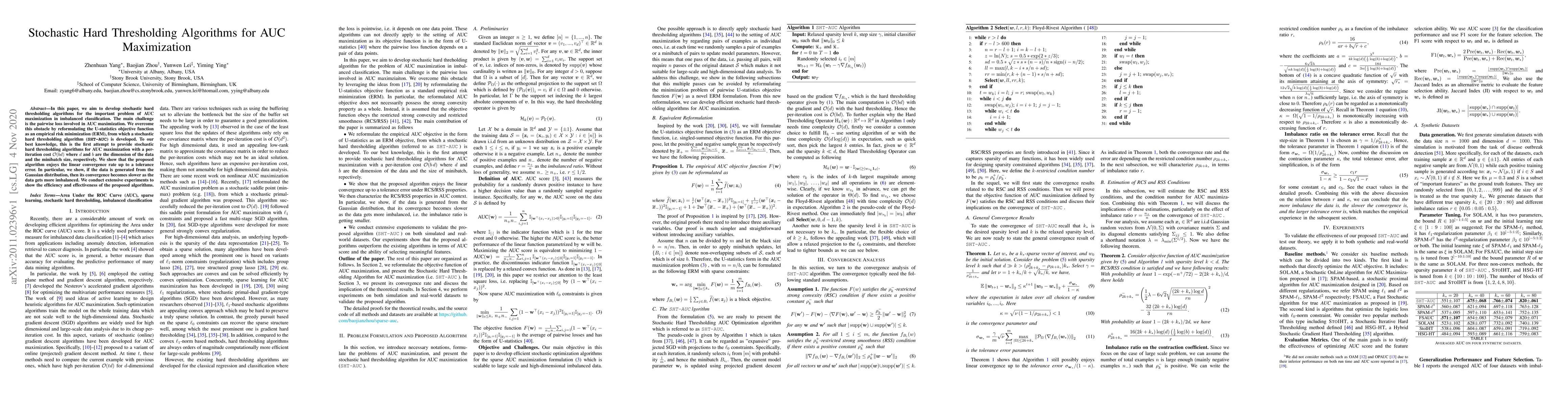 This paper develops stochastic hard thresholding algorithms (\texttt{SHT-AUC}) for AUC maximization in imbalanced classification, reformulating the U-statistics objective as an empirical risk minimization. The proposed method achieves linear convergence and is efficient with a per-iteration cost of $\O(b d)$.
