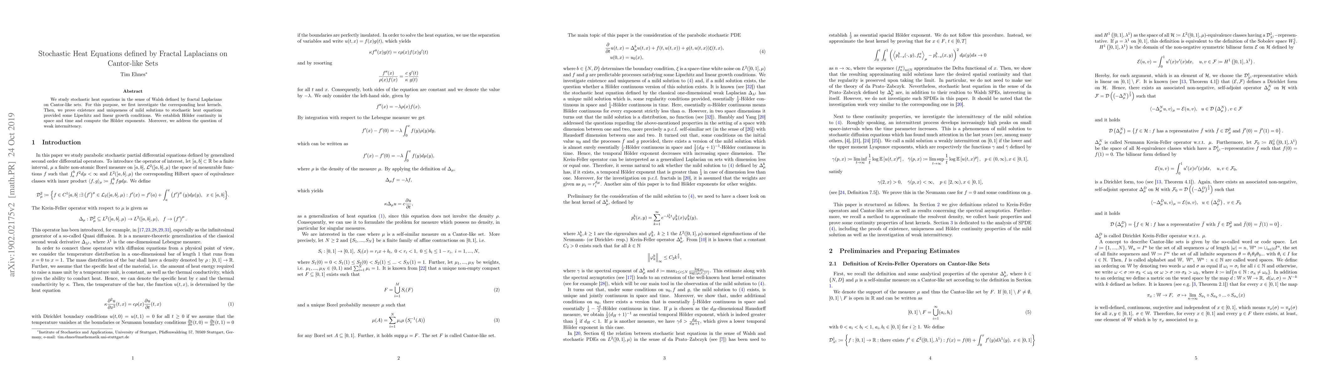 This paper explores stochastic heat equations defined by fractal Laplacians on Cantor-like sets, proving existence and uniqueness of mild solutions under specified conditions. It also investigates the H\"older continuity and computes the H\"older exponents, while addressing weak intermittency.