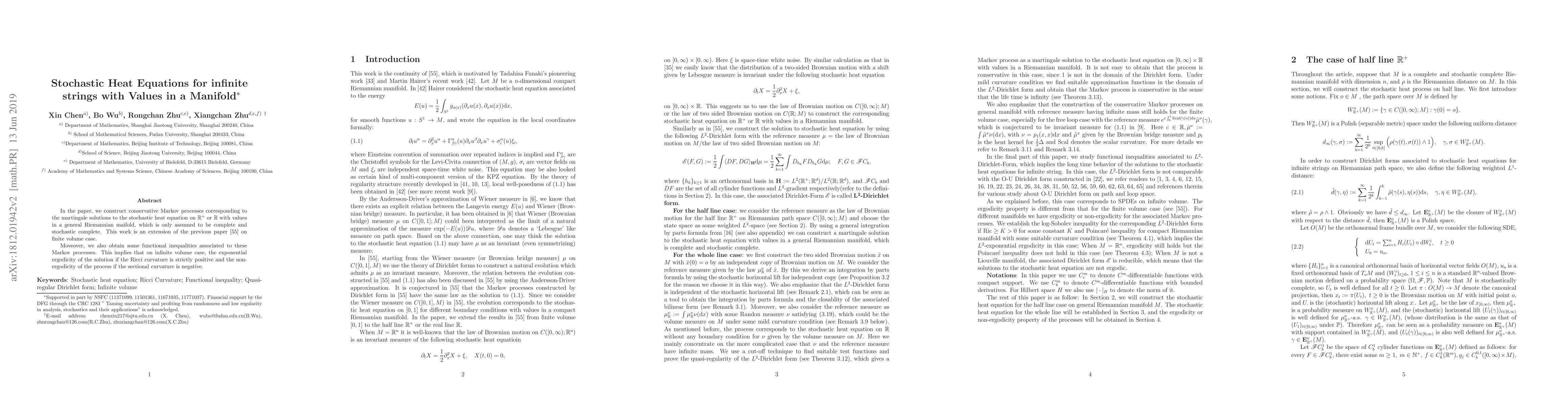 This paper constructs conservative Markov processes for stochastic heat equations on infinite strings with values in a complete Riemannian manifold, extending previous finite volume results. It also establishes functional inequalities, showing exponential ergodicity when Ricci curvature is positive and non-ergodicity when sectional curvature is negative.