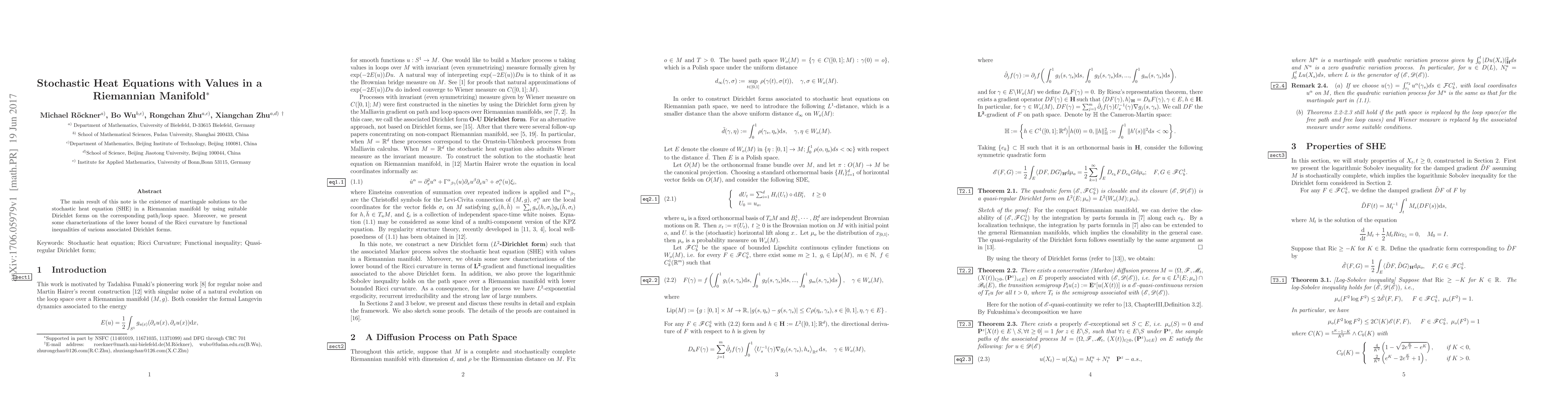 The main result of this note is the existence of martingale solutions to the stochastic heat equation (SHE) in a Riemannian manifold by using suitable Dirichlet forms on the corresponding path/loop space. Moreover, we present some characterizations of the lower bound of the Ricci curvature by functional inequalities of various associated Dirichlet forms.