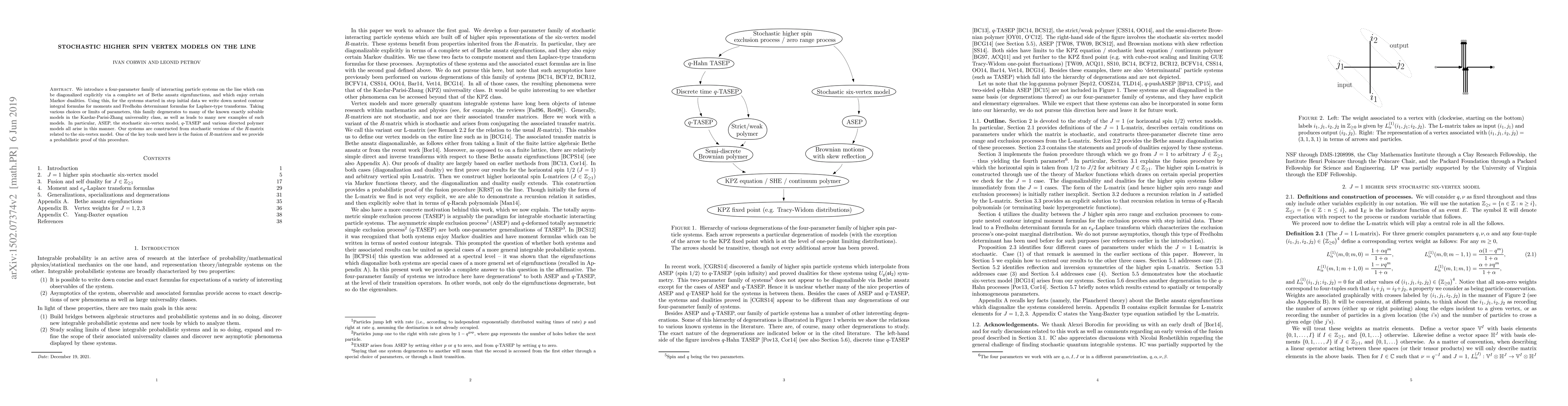 We introduce a four-parameter family of interacting particle systems on the line which can be diagonalized explicitly via a complete set of Bethe ansatz eigenfunctions, and which enjoy certain Markov dualities. Using this, for the systems started in step initial data we write down nested contour integral formulas for moments and Fredholm determinant formulas for Laplace-type transforms. Taking various choices or limits of parameters, this family degenerates to many of the known exactly solvable models in the Kardar-Parisi-Zhang universality class, as well as leads to many new examples of such models. In particular, ASEP, the stochastic six-vertex model, q-TASEP and various directed polymer models all arise in this manner. Our systems are constructed from stochastic versions of the R-matrix related to the six-vertex model. One of the key tools used here is the fusion of R-matrices and we provide a probabilistic proof of this procedure.